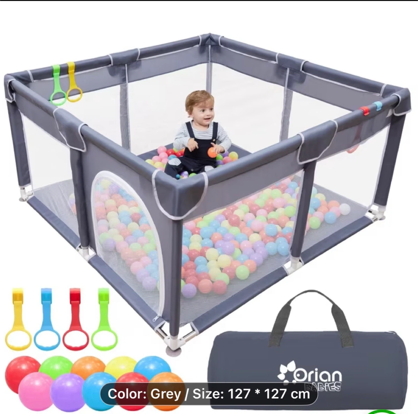 This grey Orian Babies playpen measures 127 x 127 cm. It includes a carry bag for easy transport. It's perfect for keeping little ones safe and entertained indoors or out!