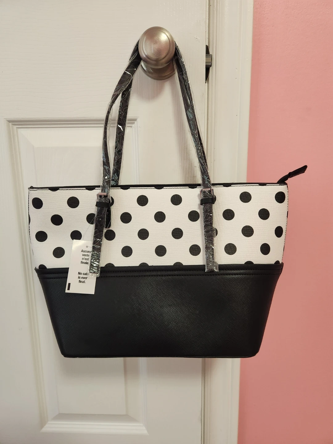 A stylish tote bag featuring a classic black and white polka dot pattern on the upper section and a black faux leather lower section. It's a great accessory for everyday use!