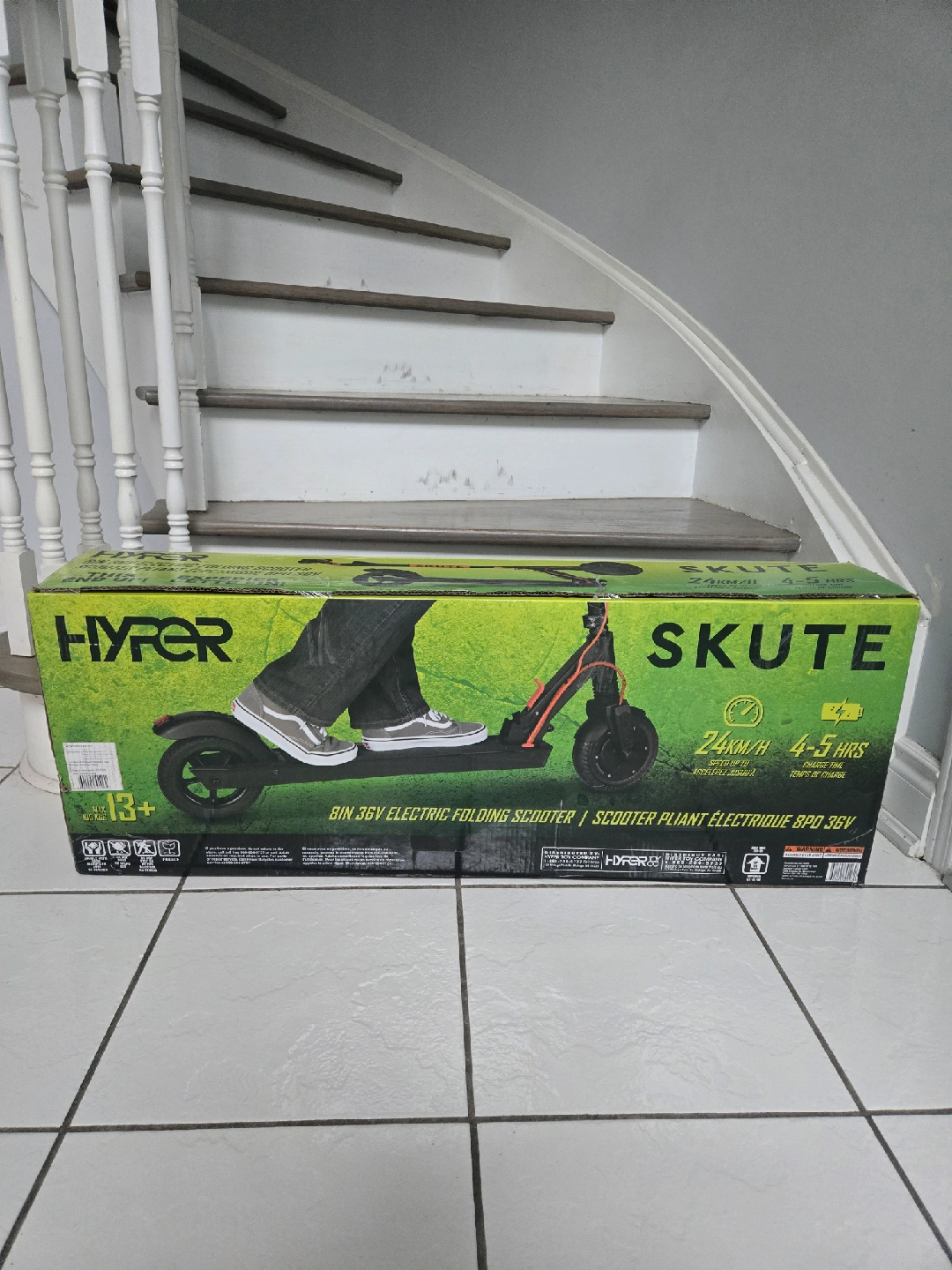 Selling a brand new Hyper Skute 8-inch 36V electric folding scooter, still in its original box! It's perfect for getting around town with a max speed of 24km/h and a battery that lasts for 4-5 hours of charge. Suitable for ages 13+