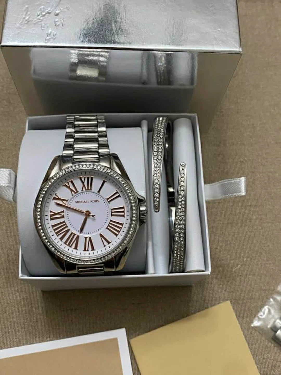 This is a Michael Kors watch and bracelet set. The watch has a stainless steel band and features Roman numerals on its white face. Two sparkling bracelets are included.