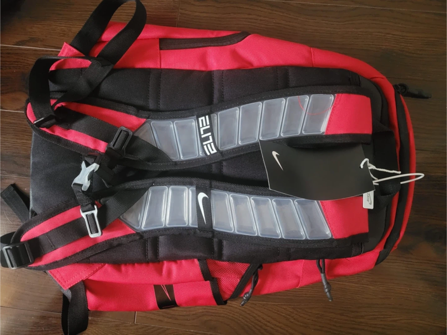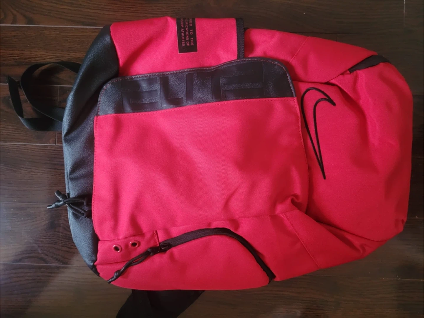 This is a red and black Nike Elite backpack. It features adjustable padded shoulder straps and multiple compartments for storage. This backpack would be great for school or sports activities.