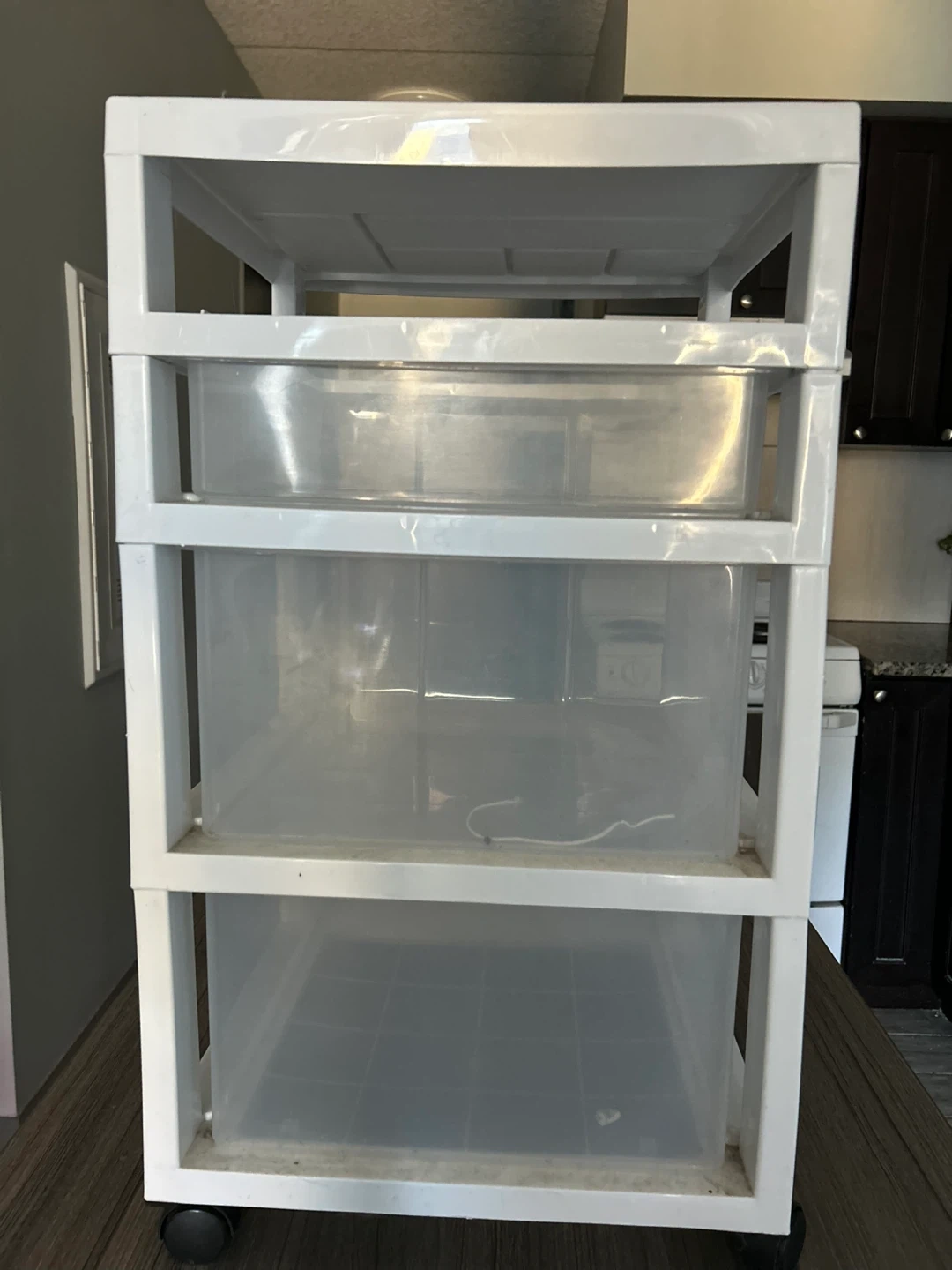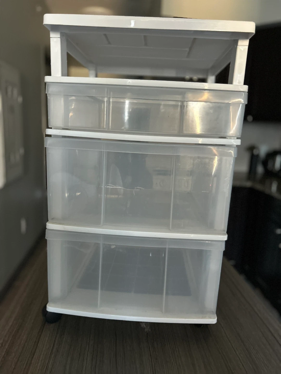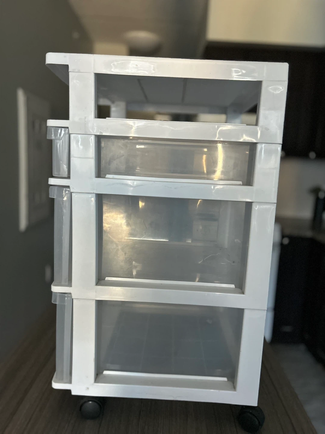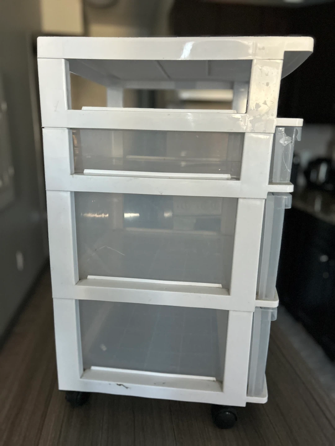 This is a white 3-drawer plastic storage cart. It has clear drawers for easy visibility. Features wheels for mobility.