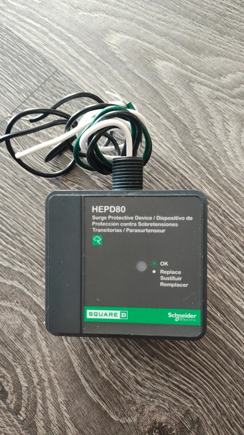 Schneider Electric HEPD80 surge protective device. Unit is dark grey with green accents. Includes wires for installation. It has an indicator light for OK or Replace status.