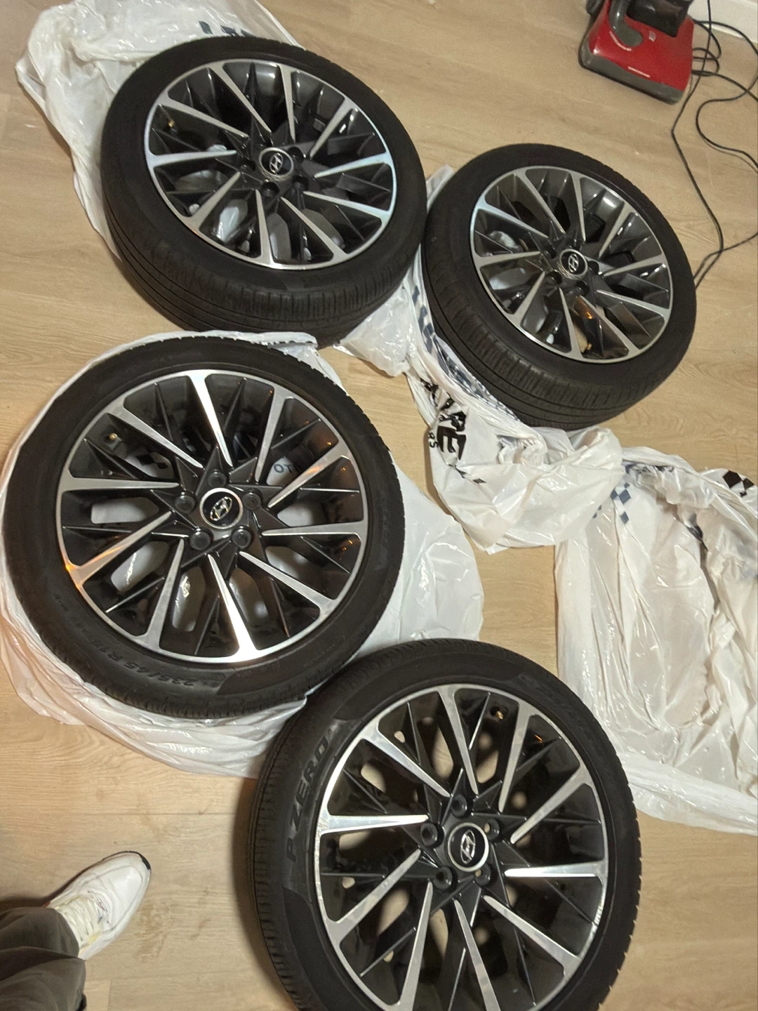 Selling a set of four Hyundai tires and rims. The tires are size 235/45 R18. They are in good condition and ready to be used! I have spade tire also One has curve damage its a scratch only.
