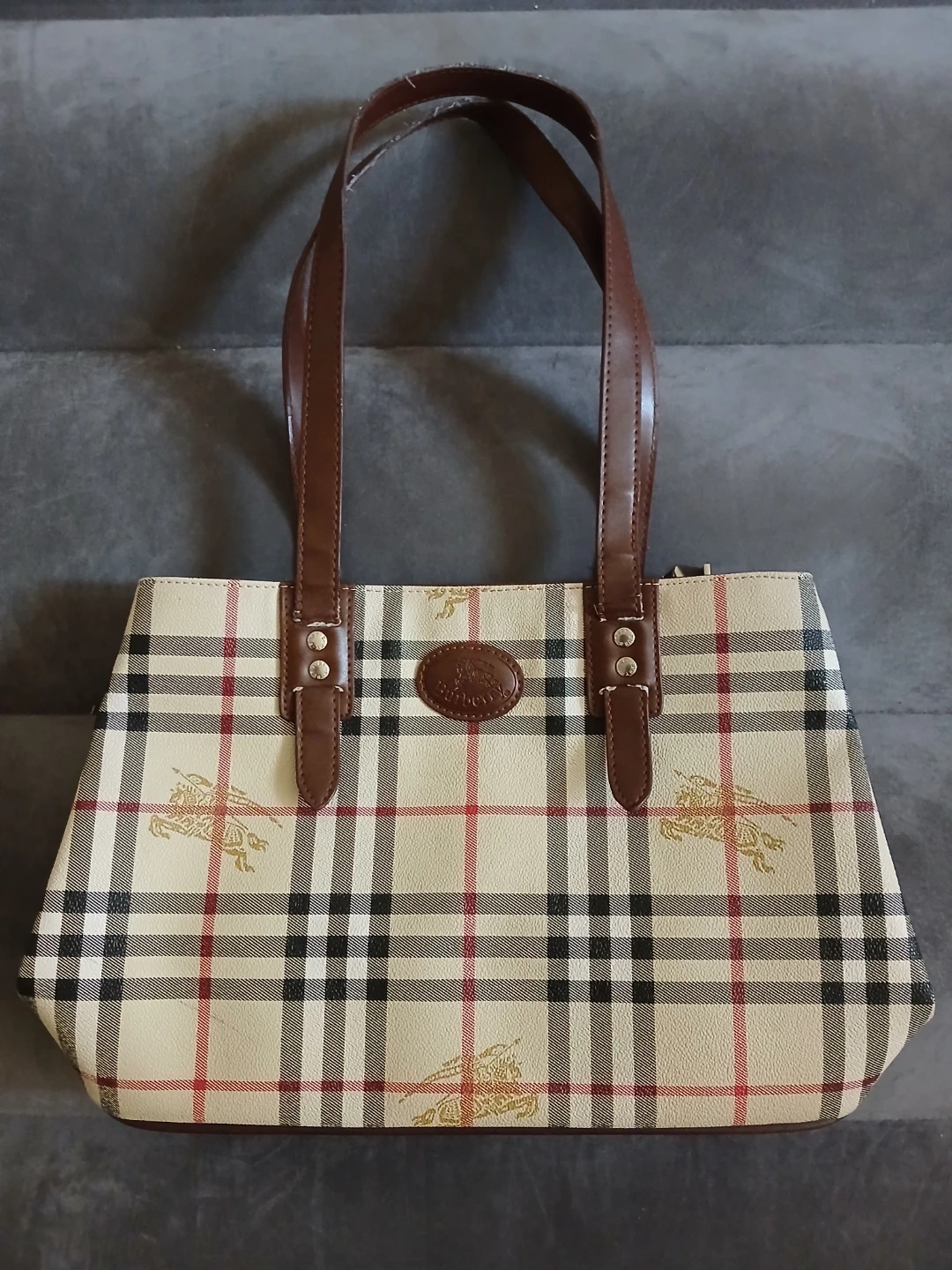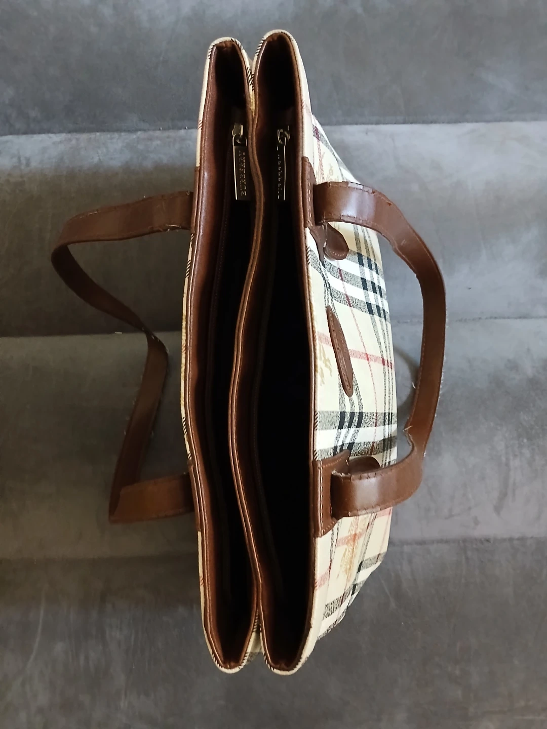 Lightly used Classic Burberry tote bag in the iconic Nova Check pattern. Features brown leather trim and handles. Includes two main compartments for organized storage. Cash only, pick up or meet up in public place.