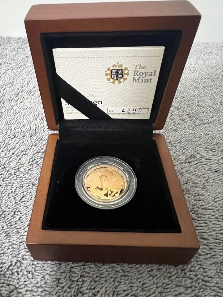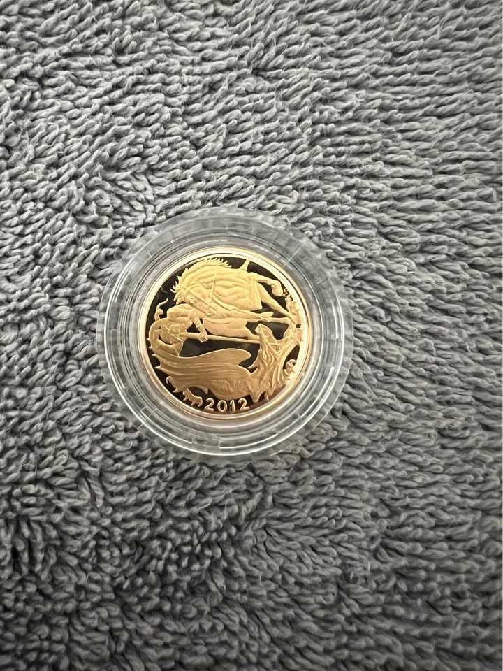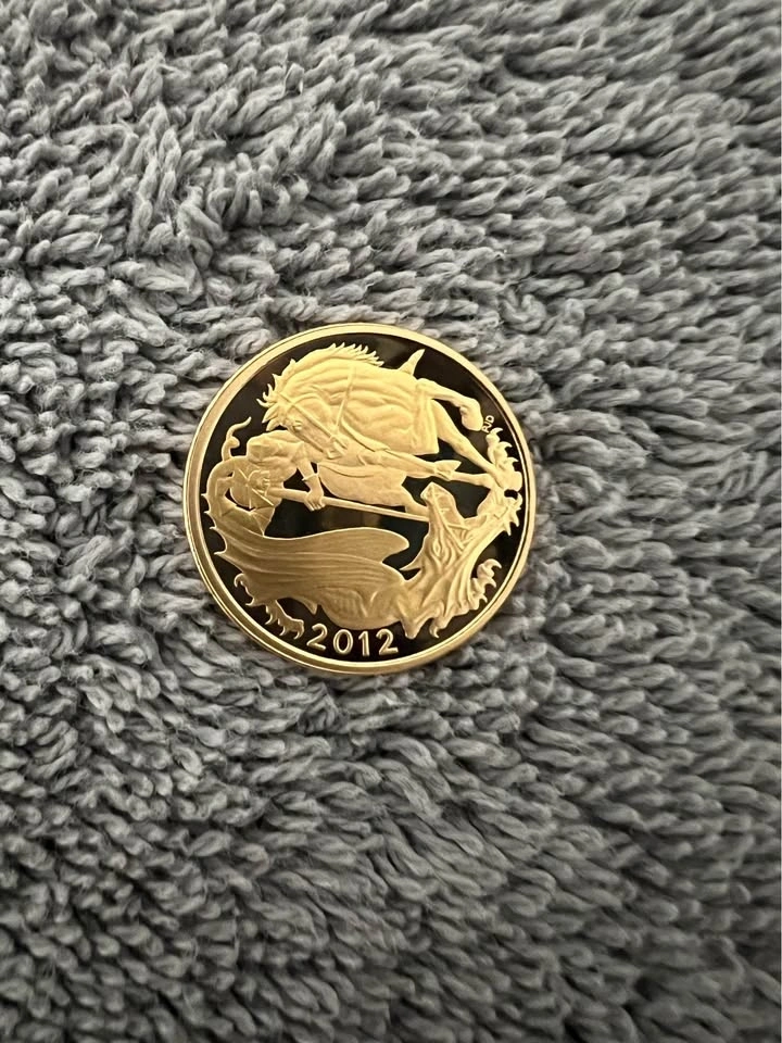 This is a beautiful 22 Karat Gold 2012 Limited Edition Mintage Round from the UK. It weighs 8 grams of 22k gold, which is 7.333 grams of pure gold. The piece comes in a beautiful wooden presentation box. It's a collector's item! Let me know if you're interested!