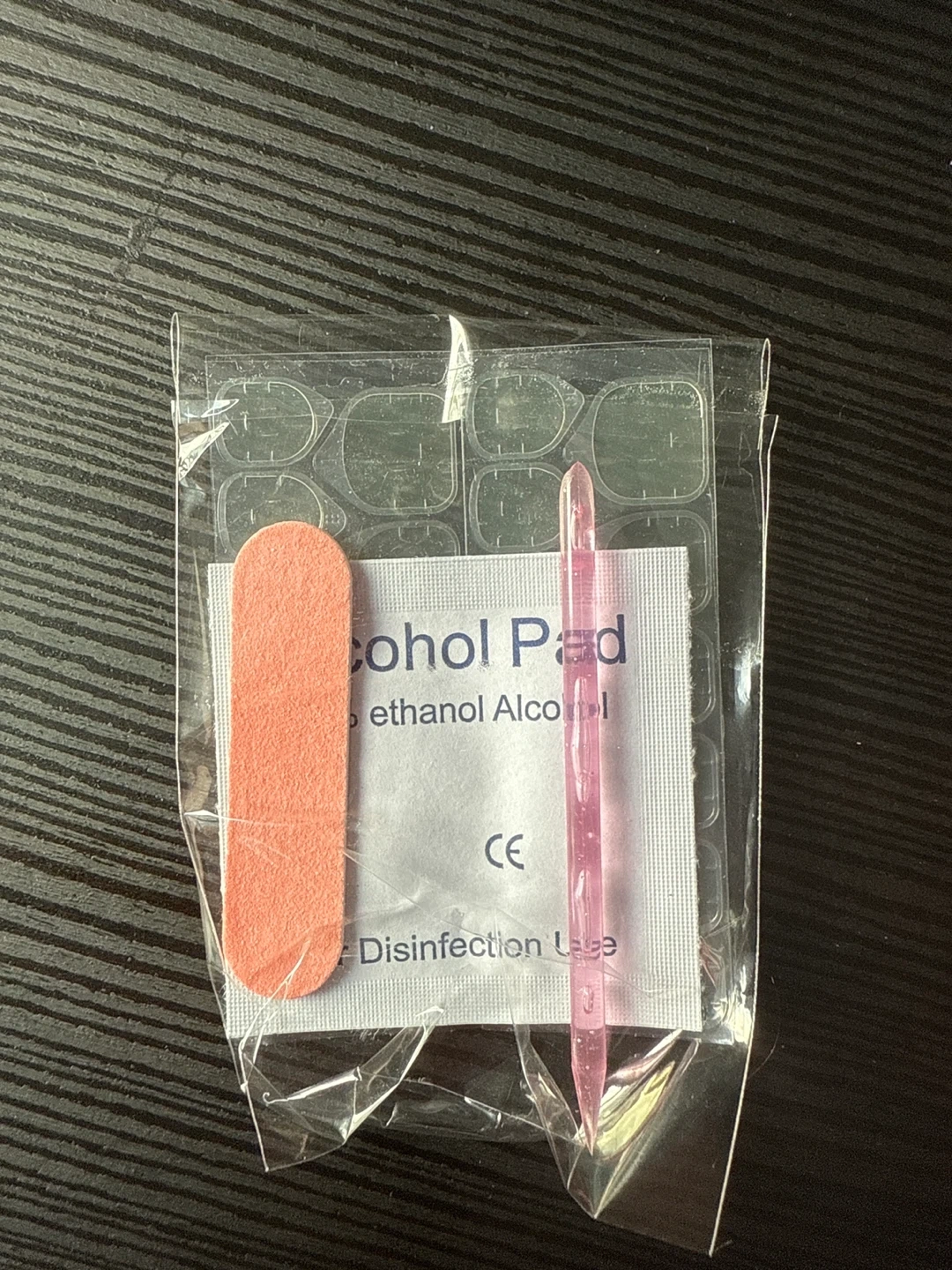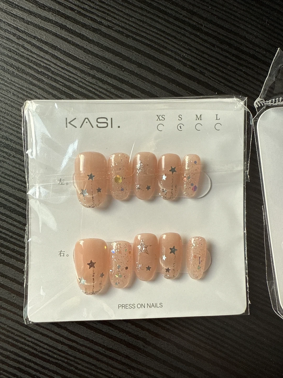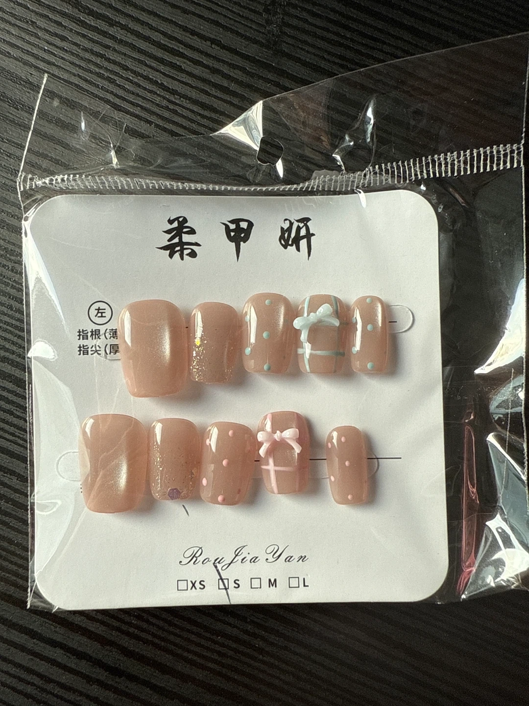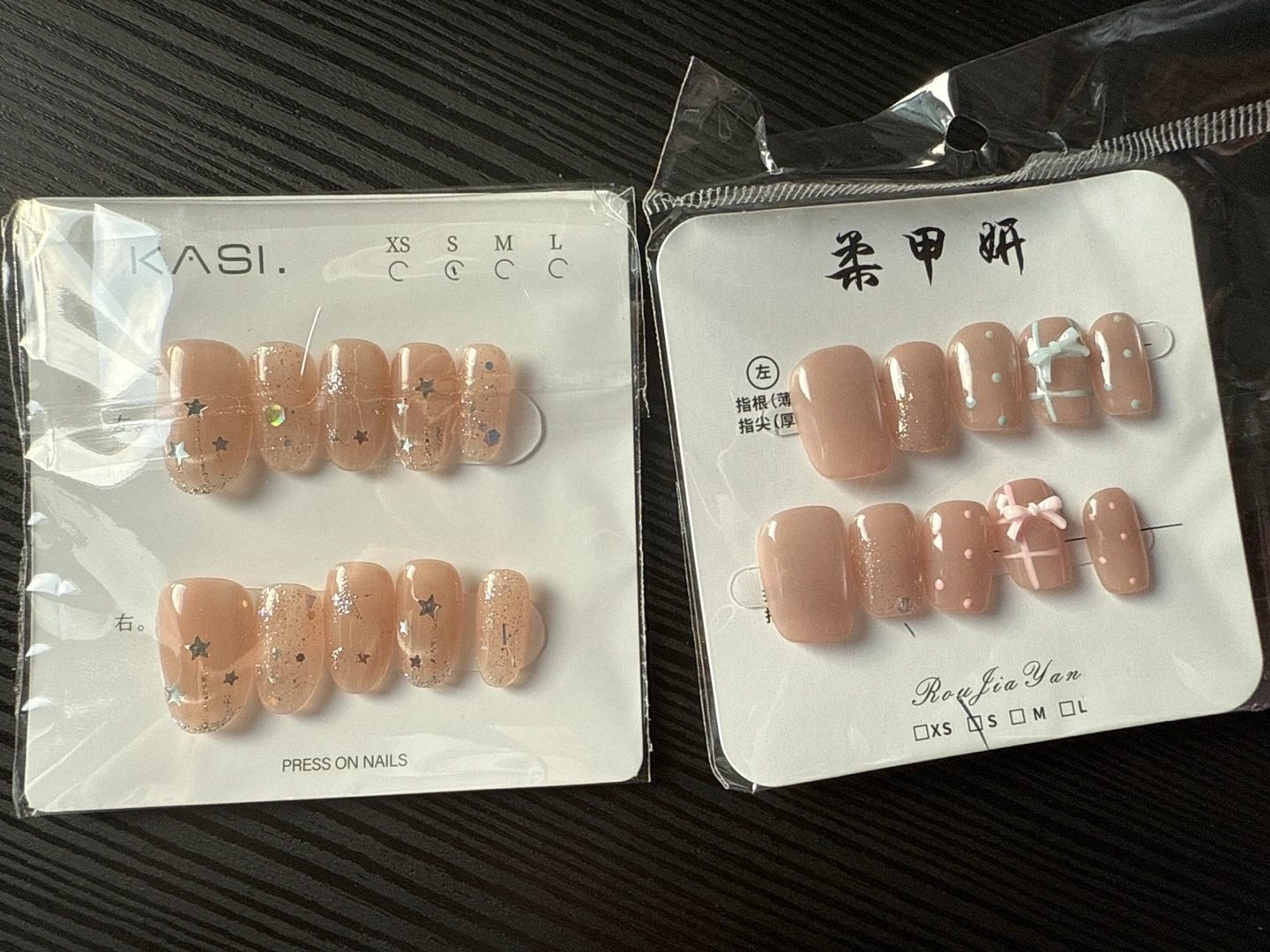 This set includes two styles of press-on nails, one with star embellishments and another with bow and polka dot designs. Both styles come in a neutral peachy-pink tone. Includes nail file, glue tabs, and cuticle stick for application. A fun way to change up your look!