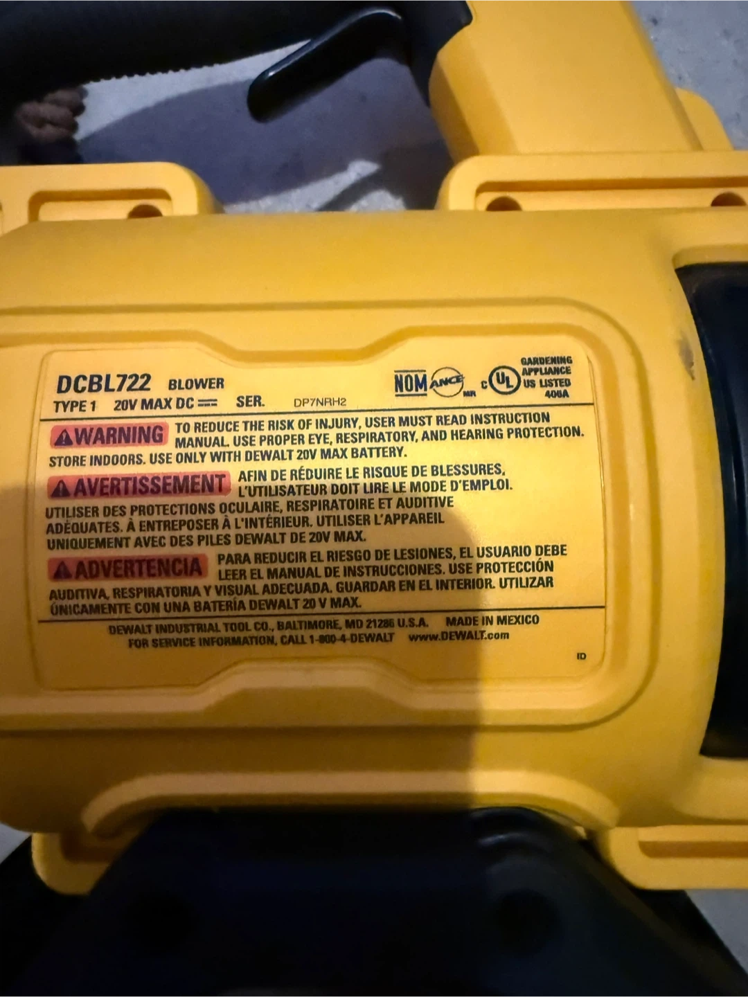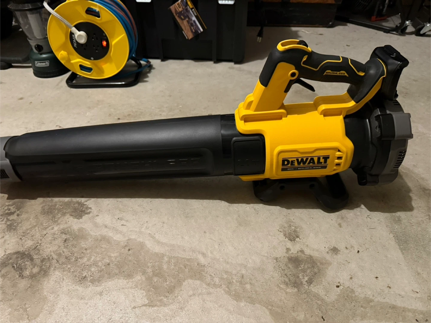 This DeWalt DCBL722 leaf blower is cordless and operates on 20V MAX Lithium Ion batteries. It's a powerful tool for yard work. Battery and charger are included