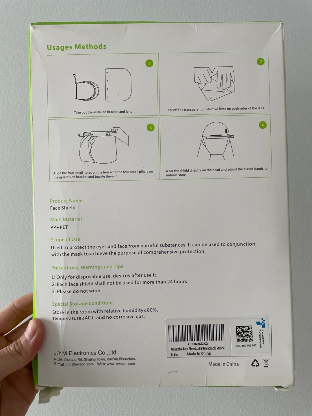 This EWA face shield is designed to protect your eyes and face from harmful substances. It's made from PP + PET material. The shield offers anti-dust, anti-fogging, and anti-saliva splash protection. This is a disposable item; destroy after use.