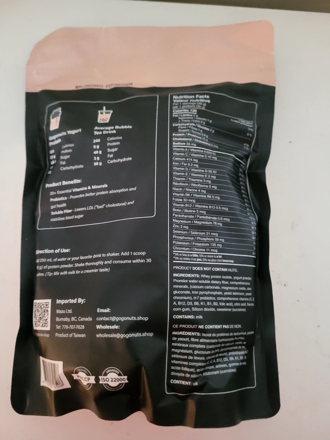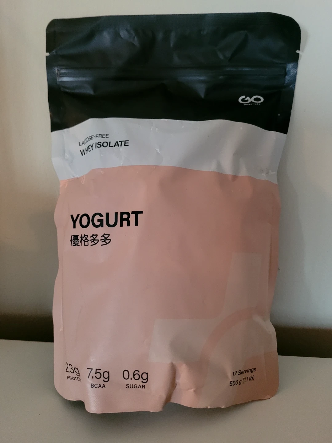 This is a lactose-free whey isolate powder with a yogurt flavour. It's 500g and provides 17 servings. The manufacturing date is August 21, 2023, and it expires on August 20, 2025. It contains milk and is produced in Taiwan. This is suitable for those looking for a protein supplement.