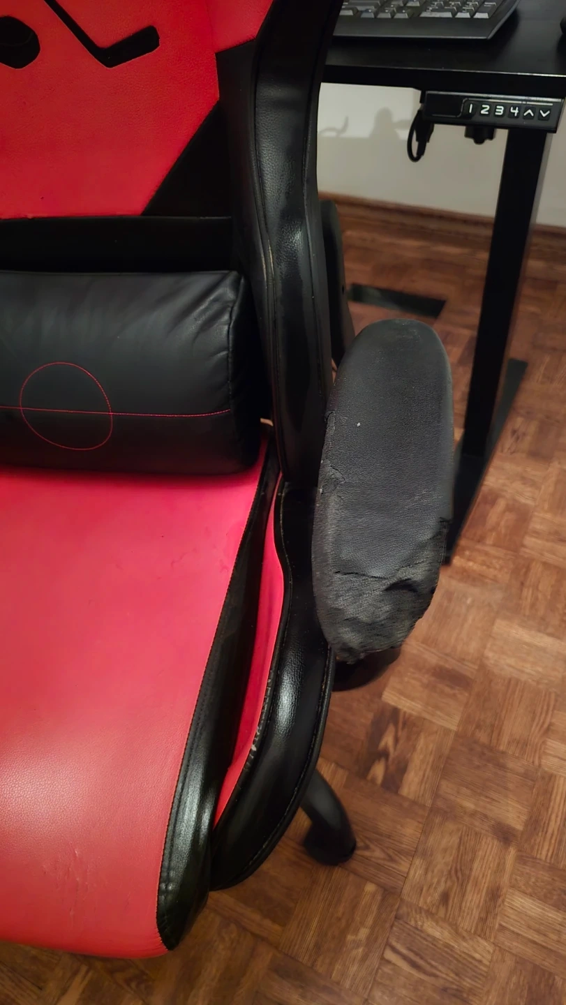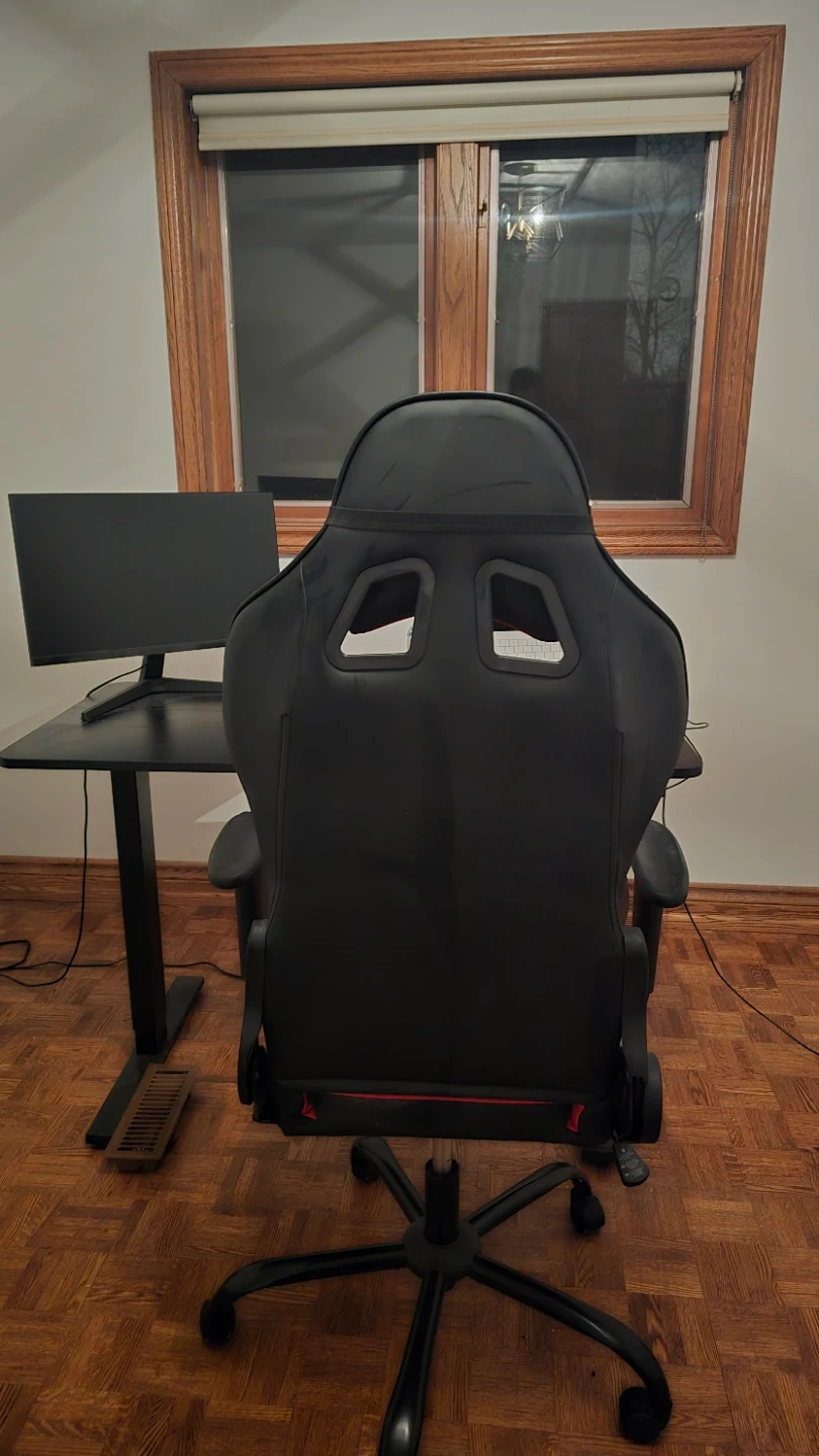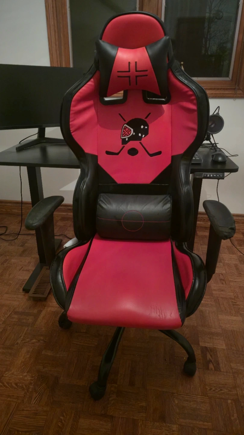 Selling a used gaming chair that's ready for a new gamer! It's black and red, and has a hockey design on the front. Please note the armrests show some wear and tear.