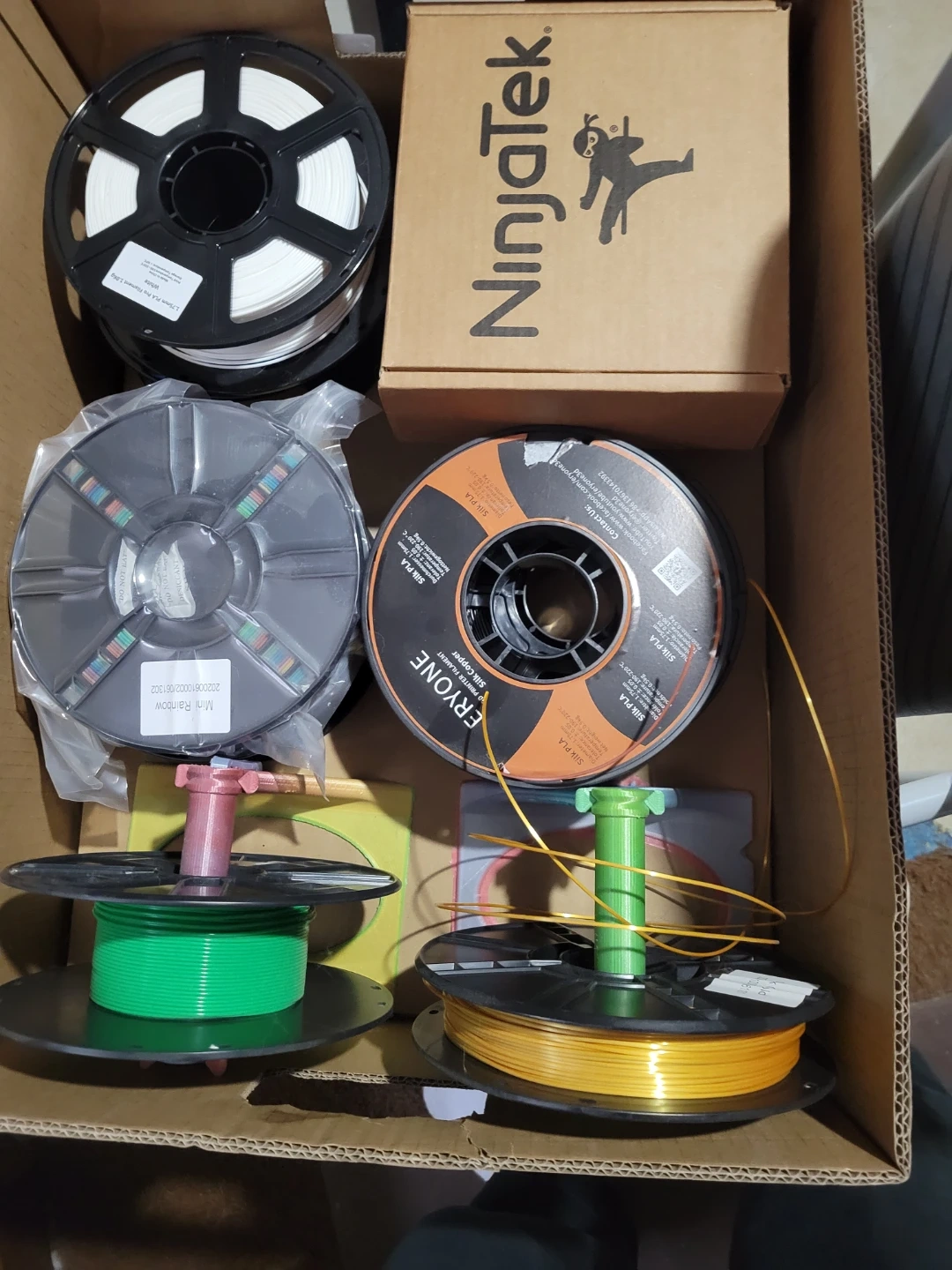 Variety of 3D printer filament spools including NinjaTek white and Eryone Silk PLA in copper and rainbow. Also includes green and yellow PLA spools on smaller holders. Filaments are 1.75mm. 9 rolls some partial some new in box/bag