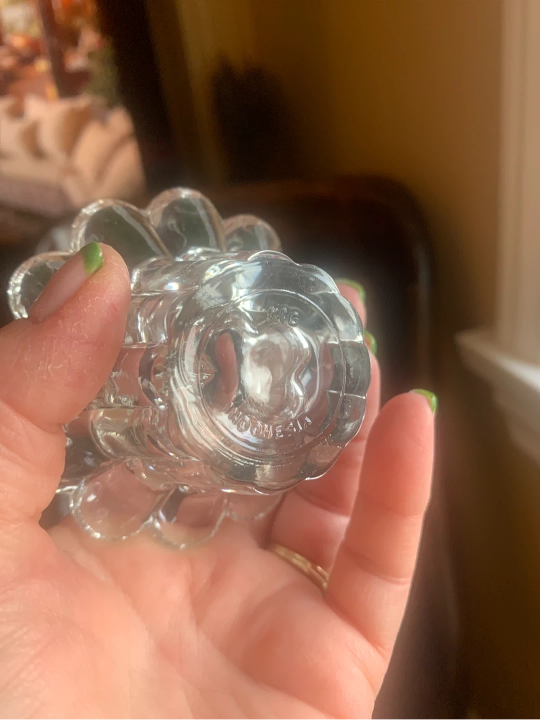 Set of two beautiful vintage crystal clear glass candle holders. Each holder is shaped like a flower with scalloped petals. They are made in Indonesia and etched on the bottom. No chips or cracks at all and they are of substantial weight. Perfect for small tea light candles or taper candles. The set is perfect for tabletop use and can be placed in your living room, dining room, bedroom, or even outdoors on your patio or terrace. Very versatile pair of holders for any decor!