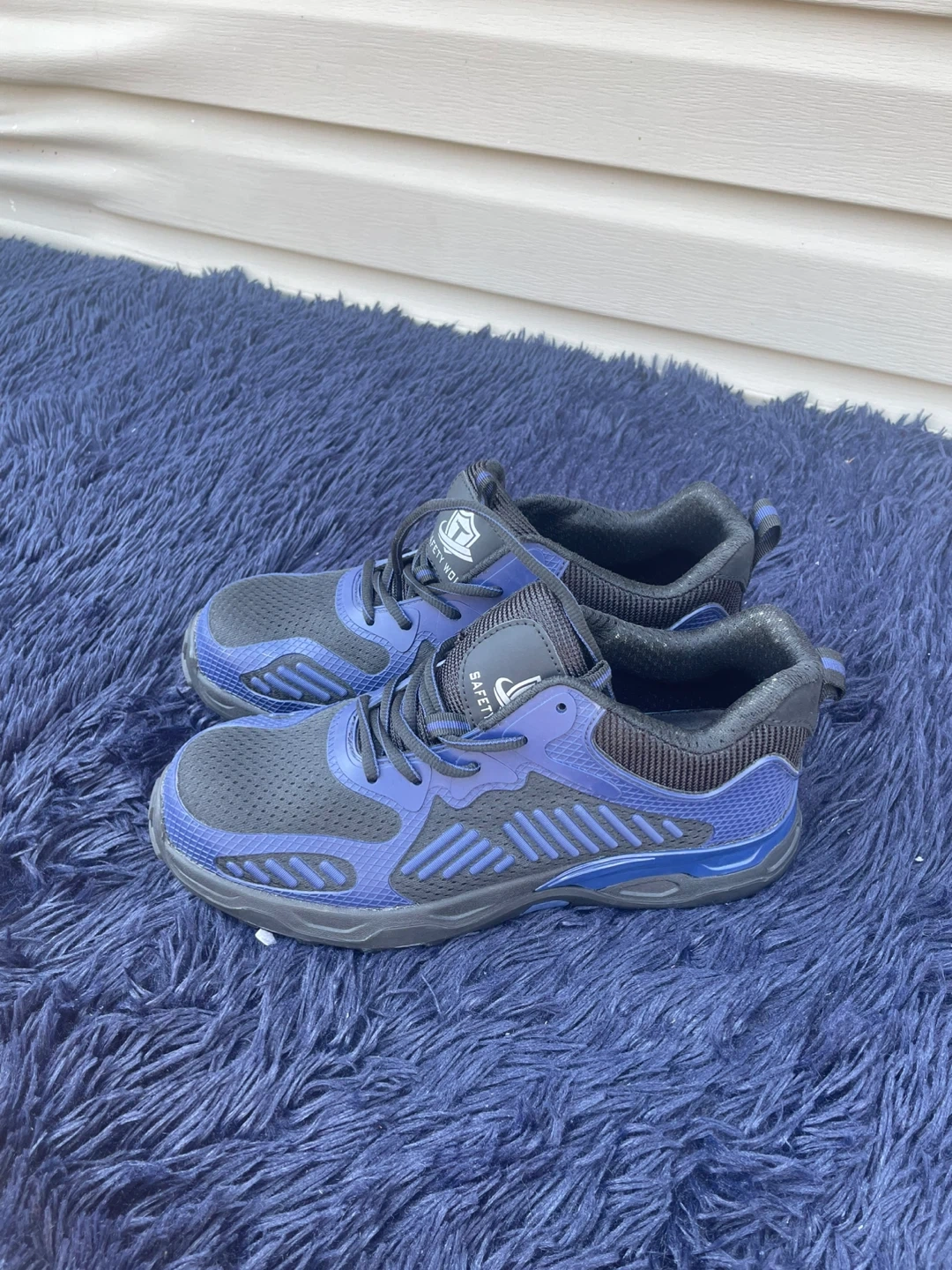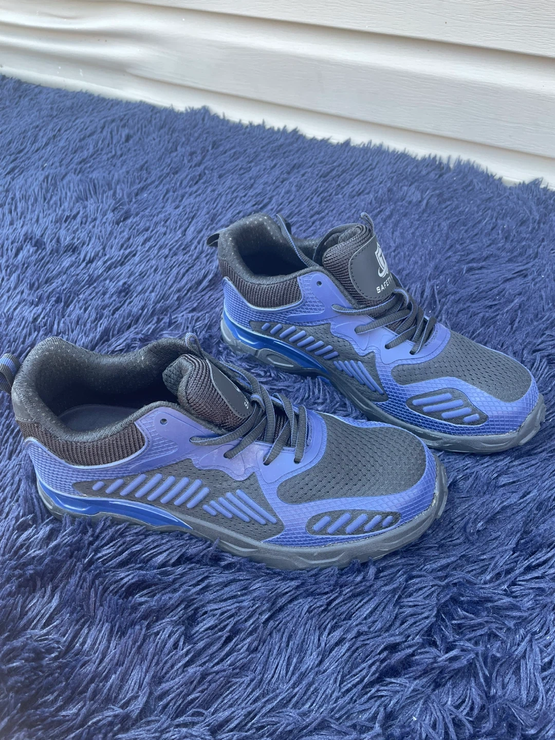 These blue and black safety work shoes feature a breathable mesh upper. They're designed for durability and comfort on the job.