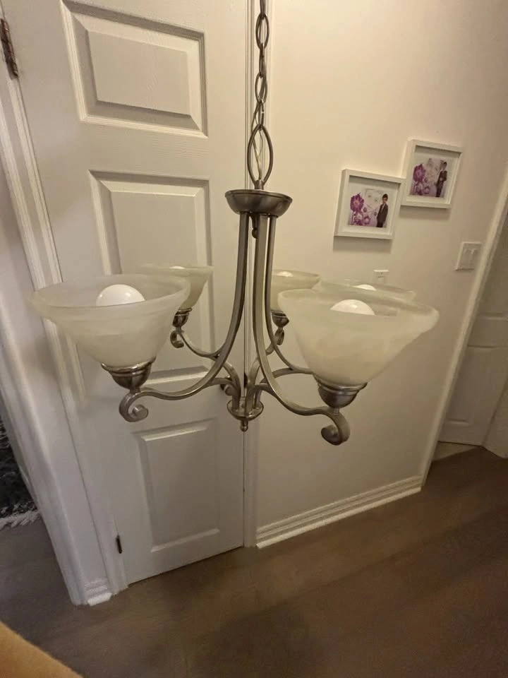 5-light ceiling fixture in brushed nickel finish with frosted glass shades. Clean classic style, good for dining room, foyer or kitchen area. Includes bulbs as shown. Pickup in Newmarket.