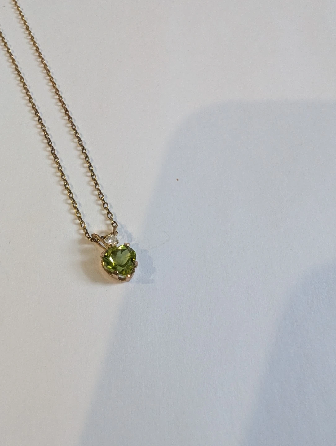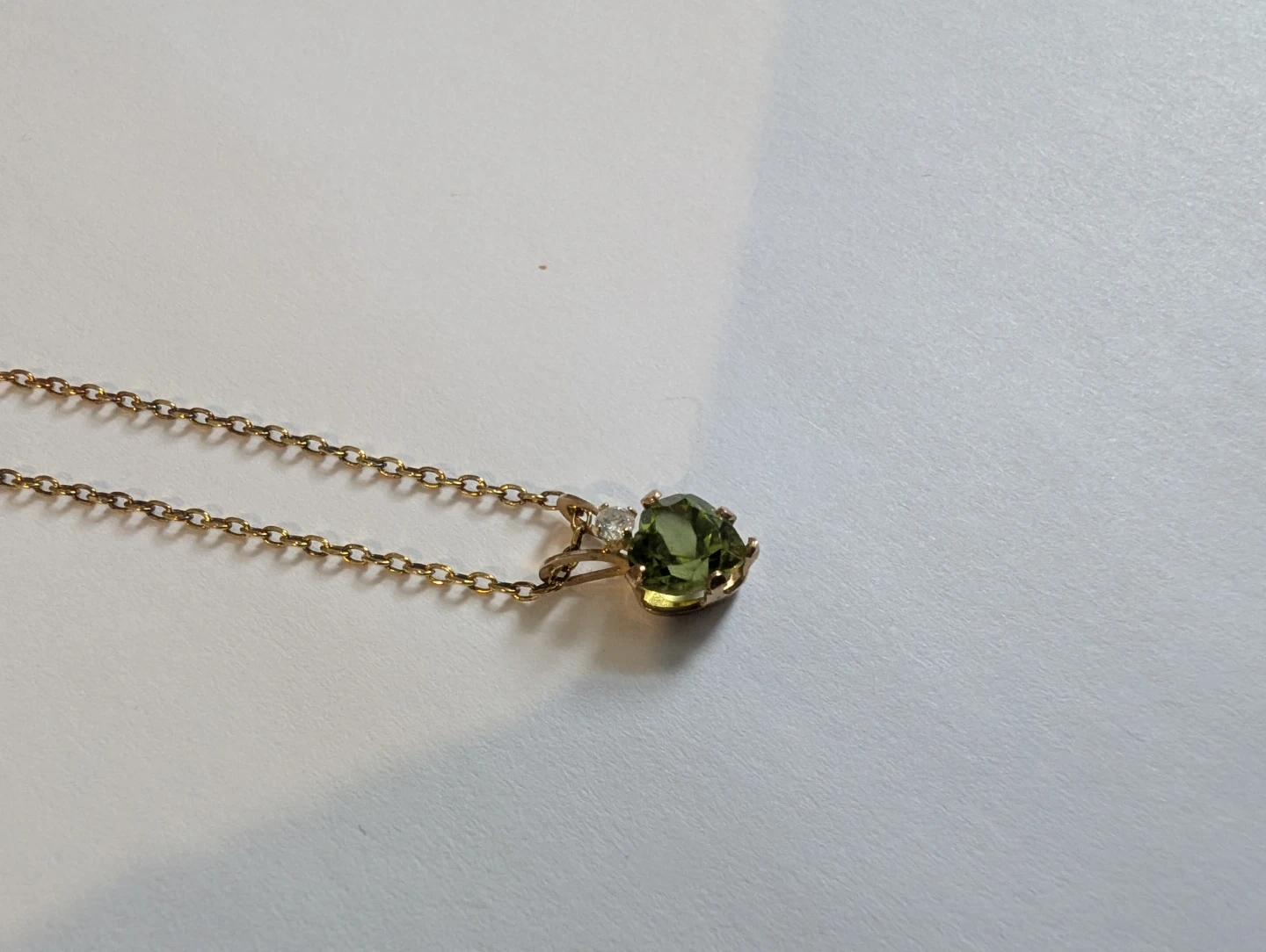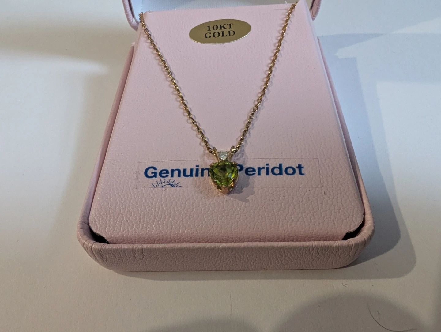 Brand new 10kt yellow gold natural peridot gemstone necklace and pendant for sale. Natural peridot gem stone 0.65ct, gold plated sterling silver chain, August birthstone, $150 FIRM.