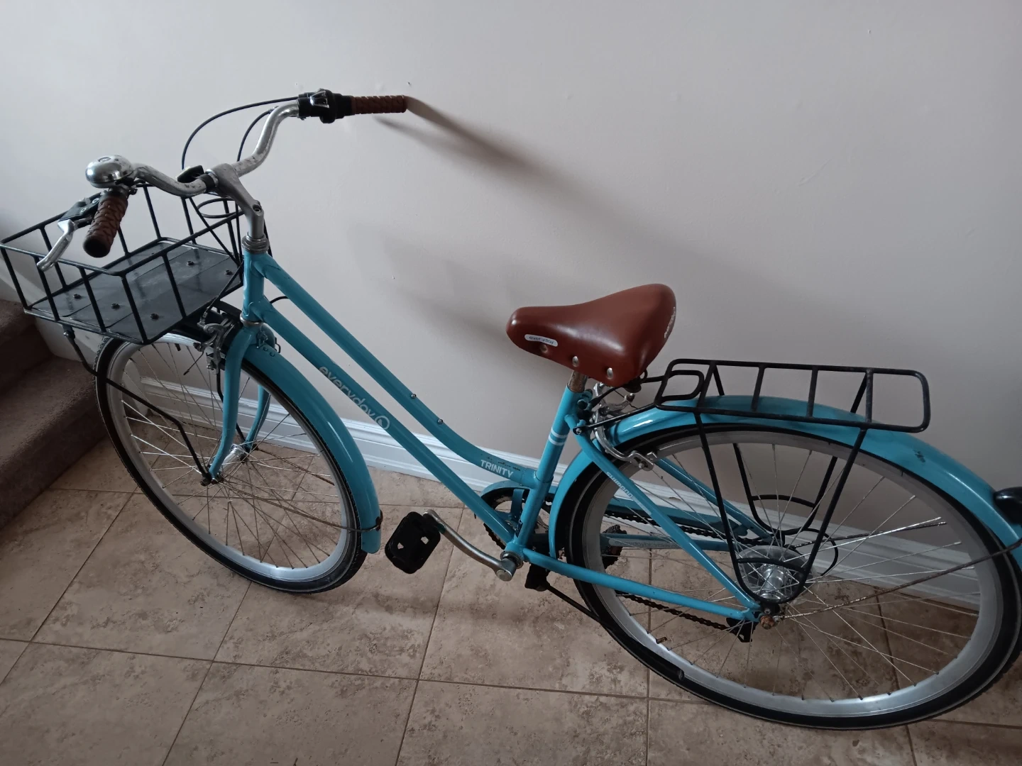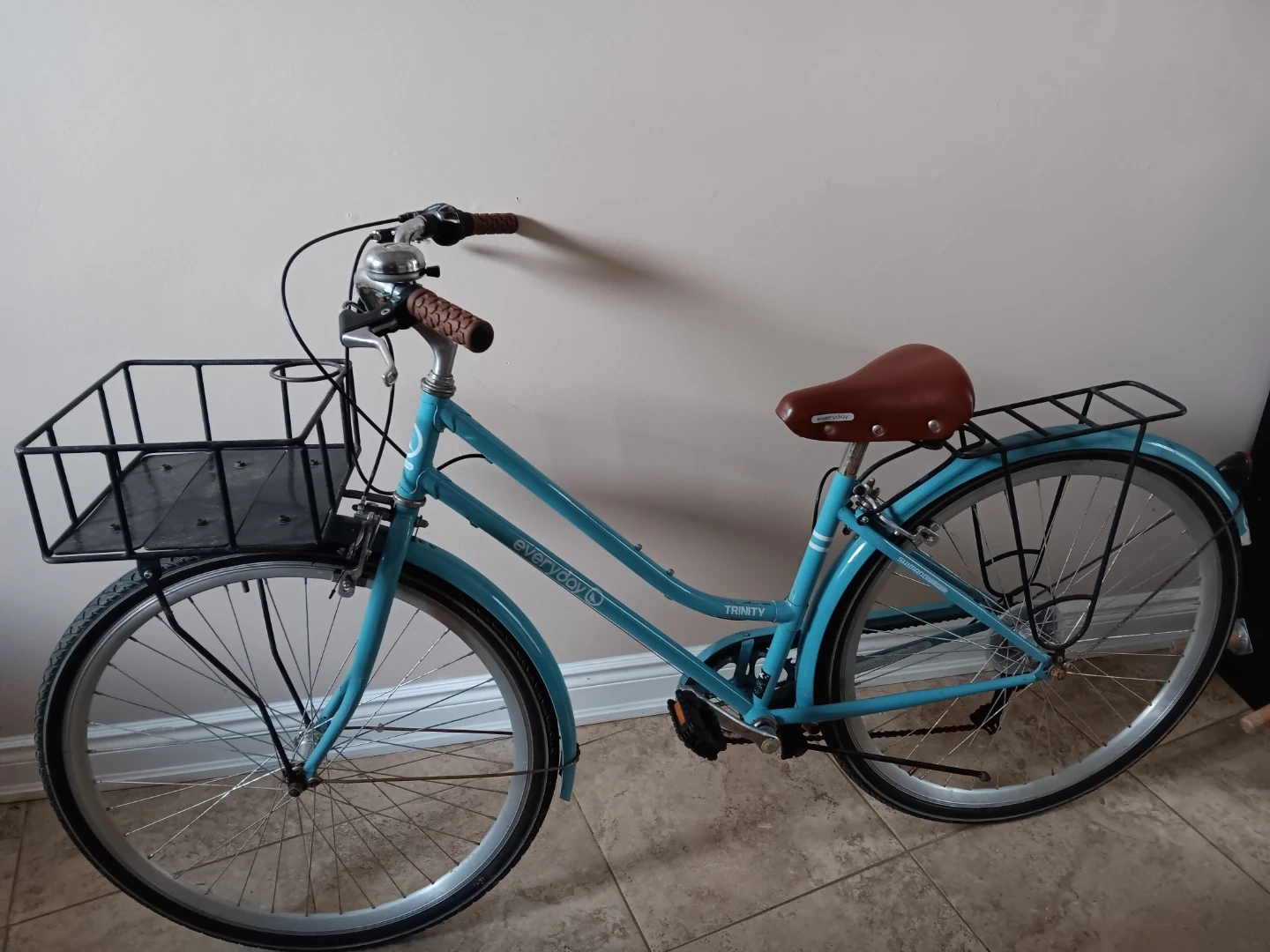 Women's hybrid bike with a front basket and rear rack. Features a comfortable brown saddle and handlebars. It's blue with silver wheels. Great for city commutes!