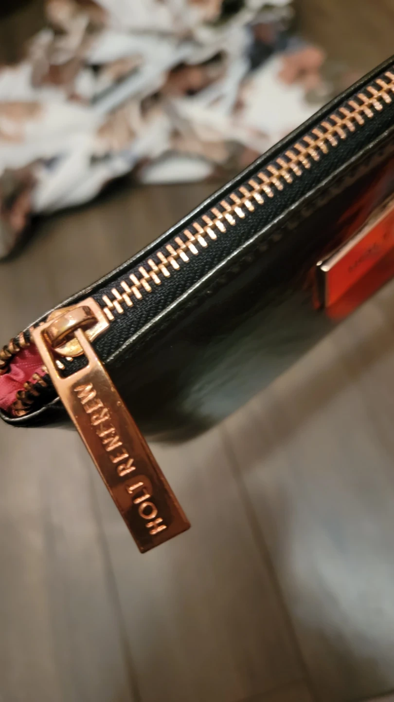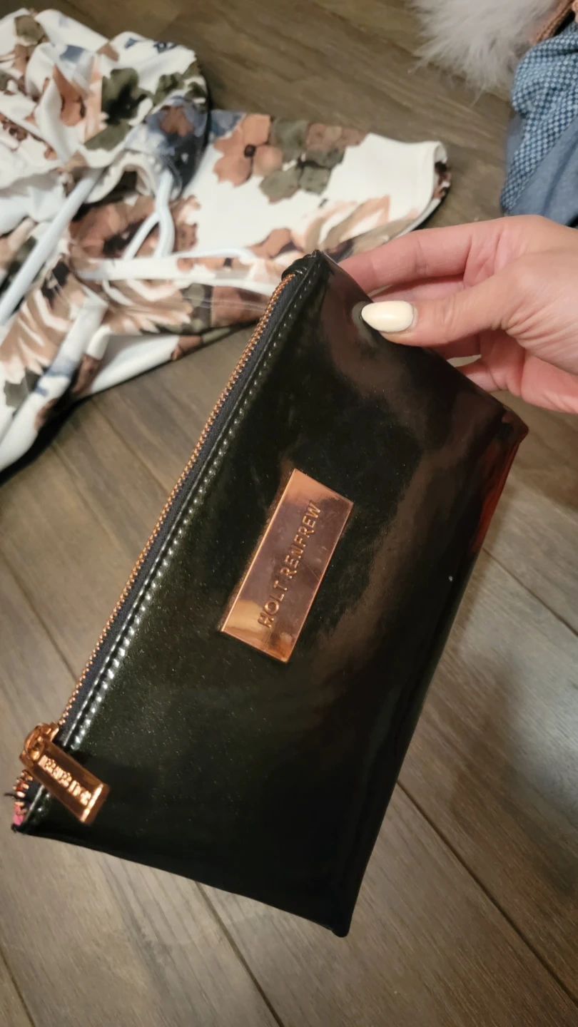 This is a shiny clutch bag from Holt Renfrew. It has rose gold hardware and a zippered closure. It's perfect for carrying your essentials or makeup or can be used a minimalist clutch for on the go or nights out