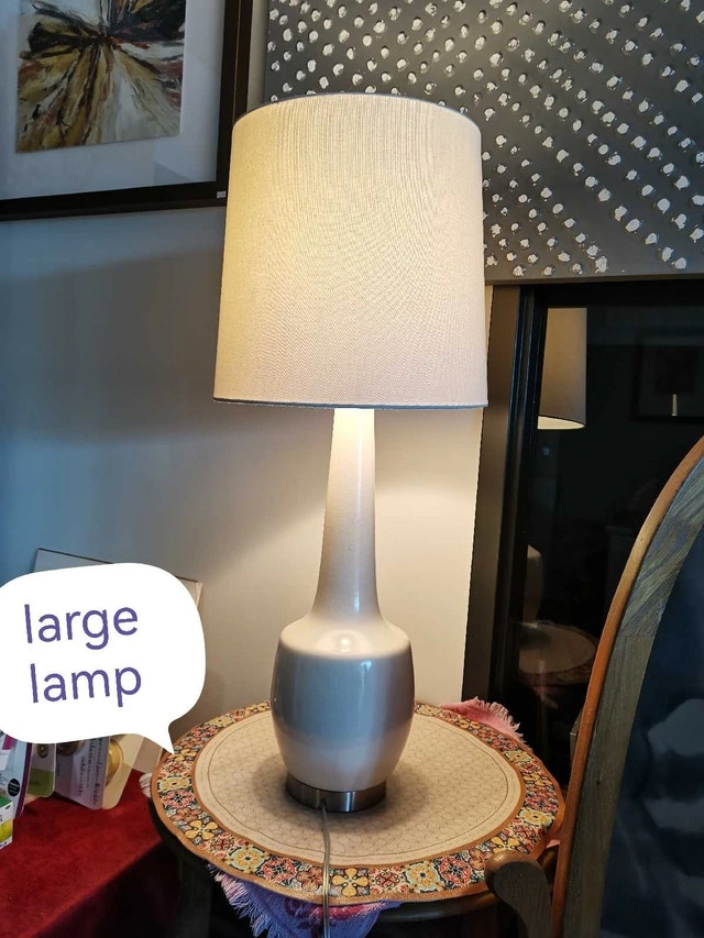 Brighten up your space with this stylish large lamp, perfect for adding a touch of elegance to any room. It's in great condition and ready to illuminate your home. * Elegant Design * Great Condition * Perfect for Living Room or Bedroom base 22", overall 35" Spruce up your decor with this lovely lamp! And hey, if the ad's still up, it's still available!