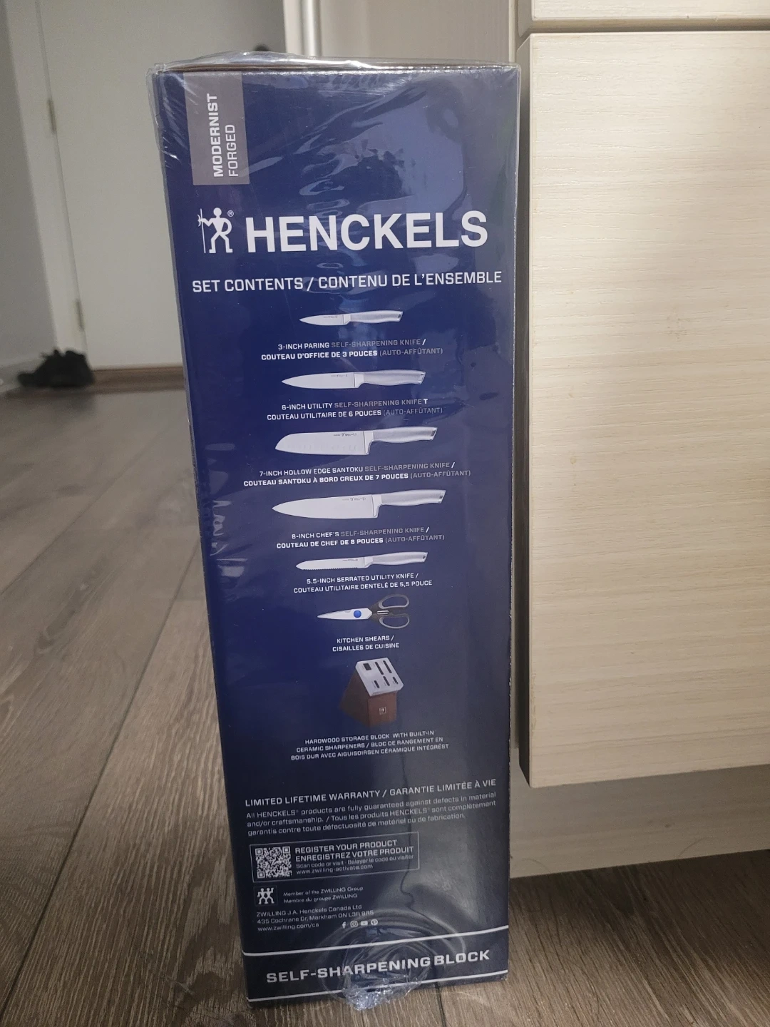 Selling a Henckels Modernist Forged 7-piece knife set with a self-sharpening block! It's a great set for any kitchen and the self-sharpening block makes maintaining your knives super easy. The set includes a variety of knives and a pair of scissors, all neatly organized in the block