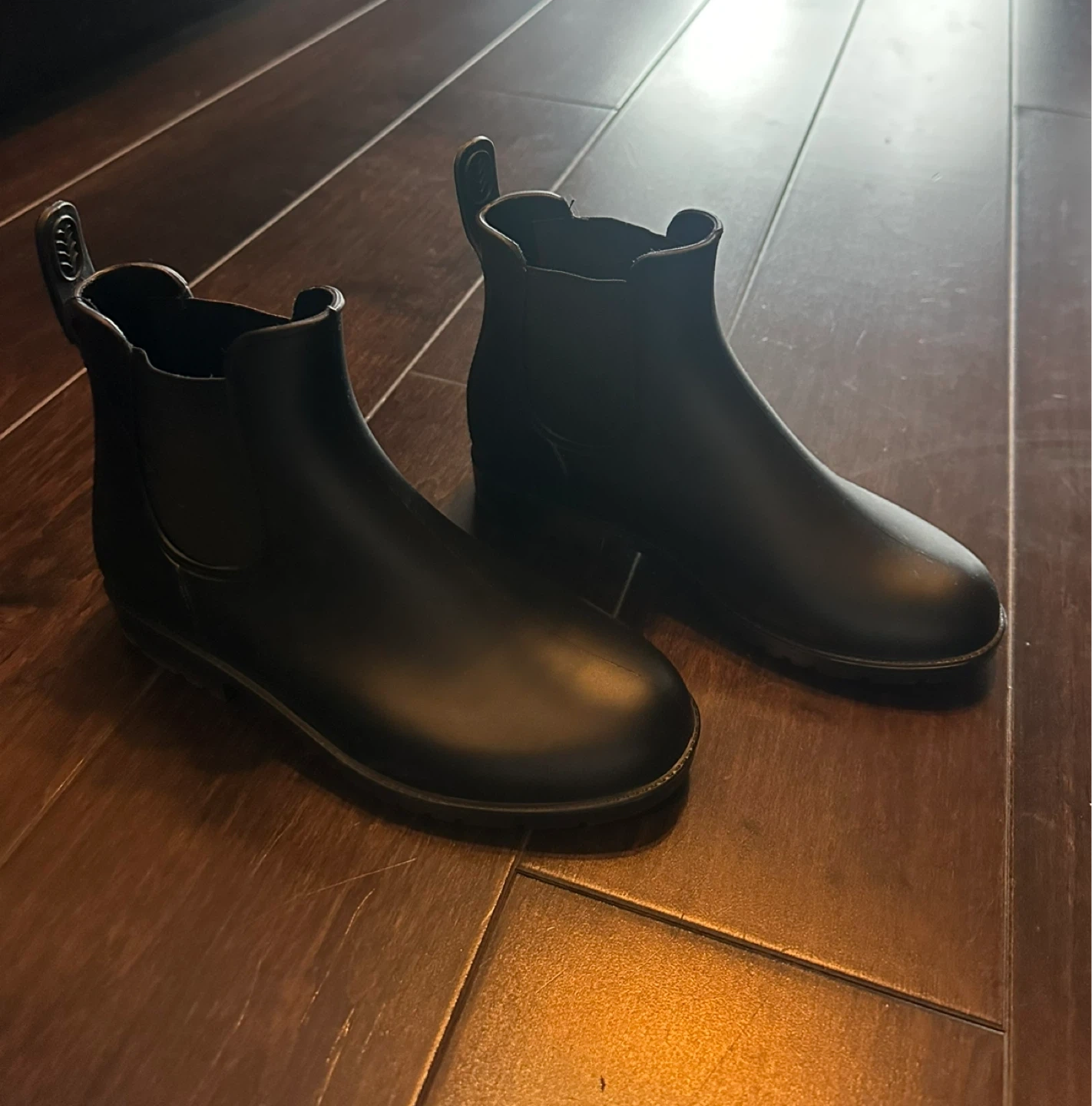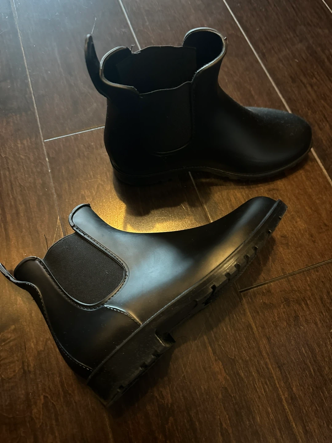 These black Chelsea rain boots are made of waterproof material. They feature elastic side panels for easy on and off. Perfect for wet weather! They're a size 6.5.