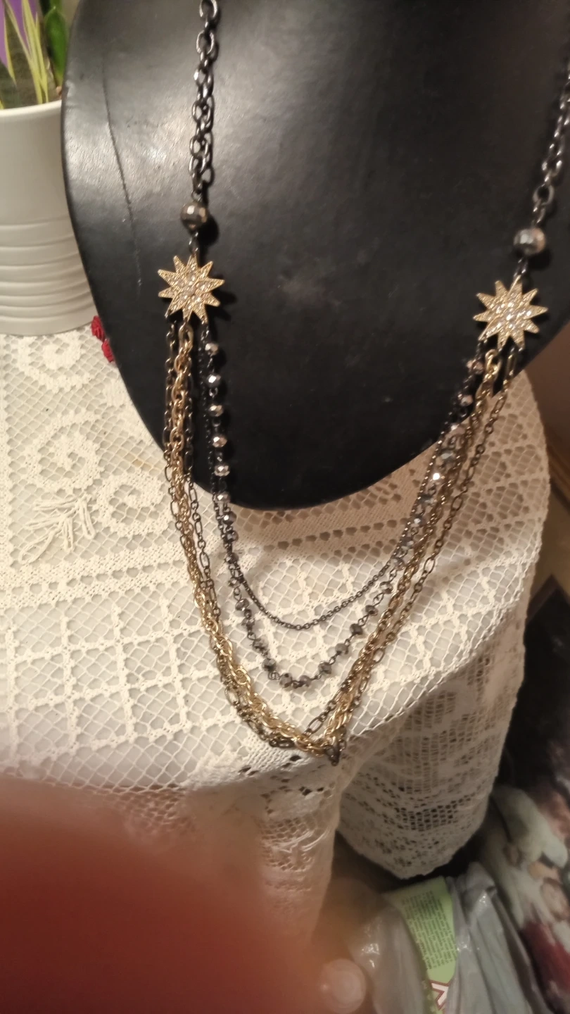 This multi-strand necklace features delicate chains in gold, silver, and gunmetal tones. It's adorned with two sparkly star charms and beaded accents. The necklace secures with a lobster clasp.