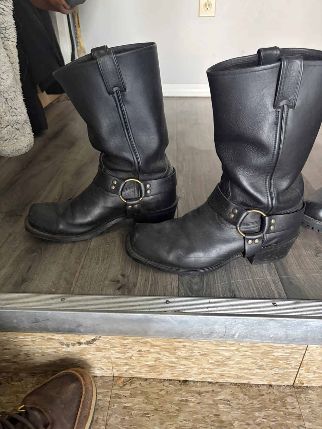 Classic black leather motorcycle boots with a buckle harness detail. These boots feature a durable construction for riding or everyday wear. Made from genuine leather.