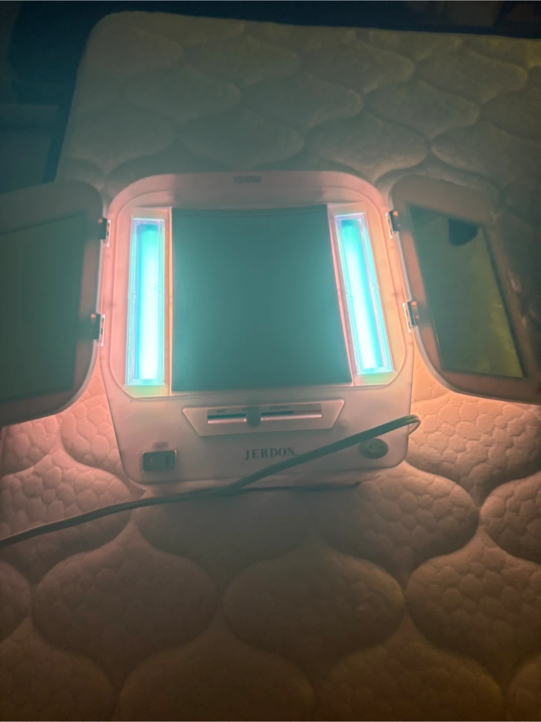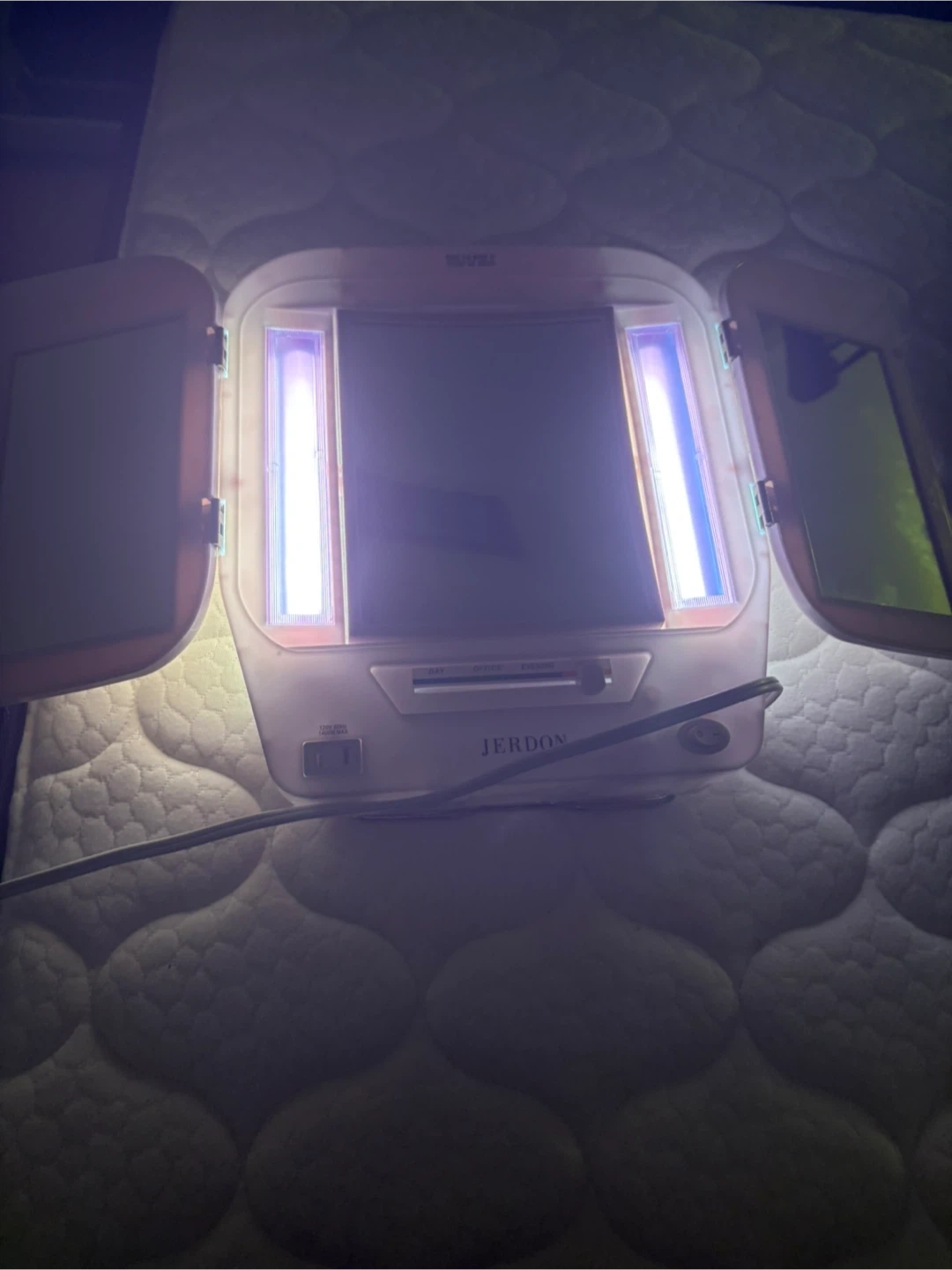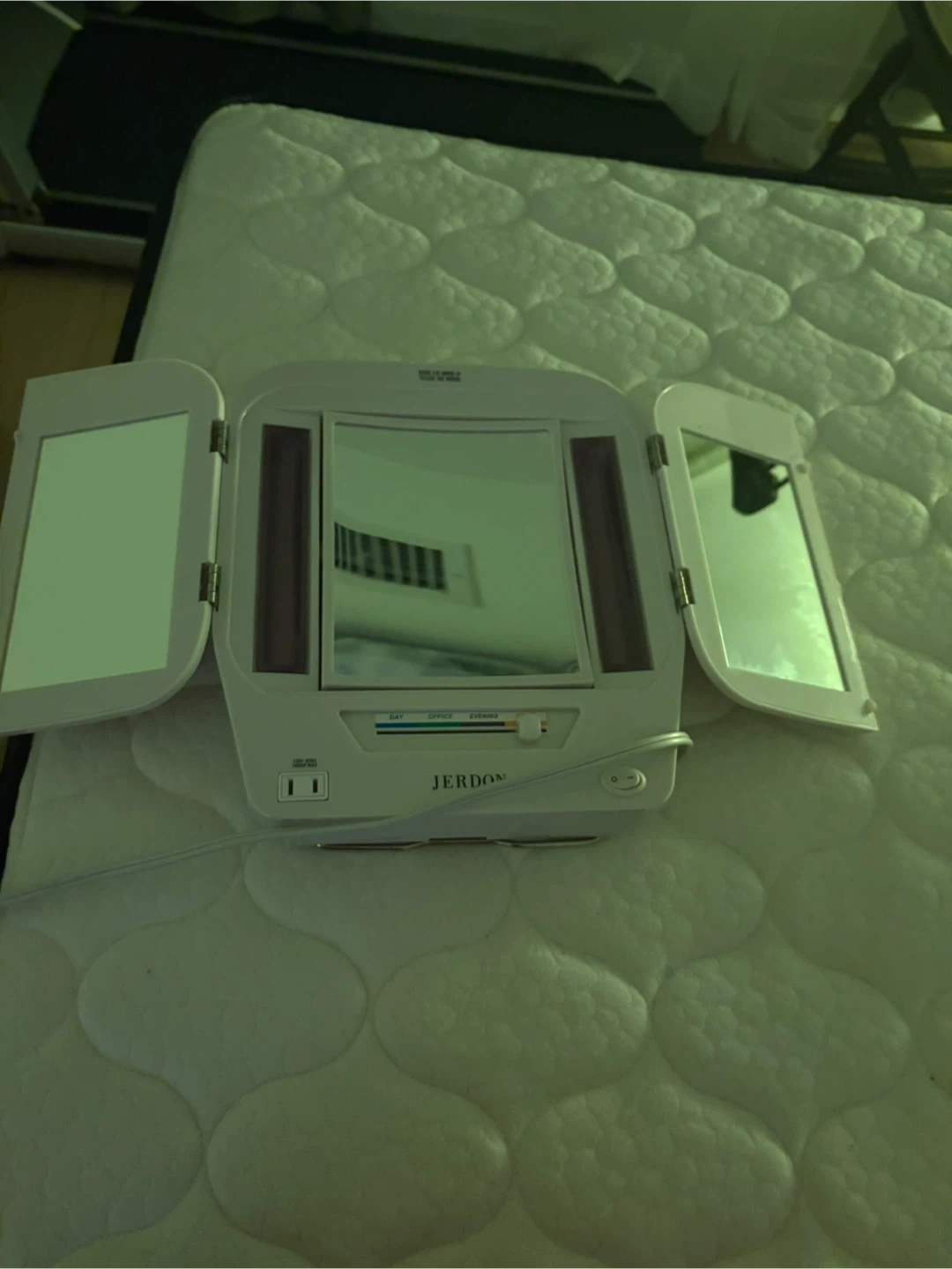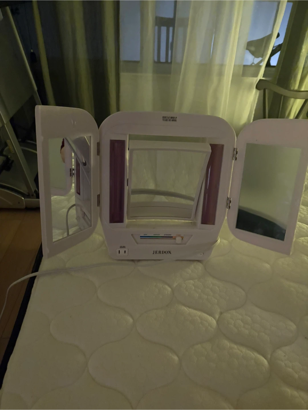 This Jerdon tri-fold vanity mirror features built-in lights for makeup application. It has adjustable light settings for 'Day', 'Office', and 'Evening' use. The mirror offers a clear reflection with side panels for a full view.
