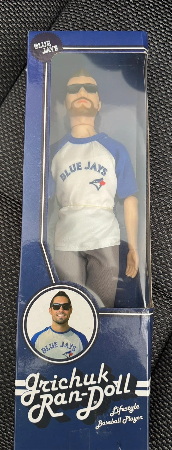 This is a Grichuk "Lifestyle Baseball Player" doll. It's designed to represent a Toronto Blue Jays player. The packaging includes several photos of players.
