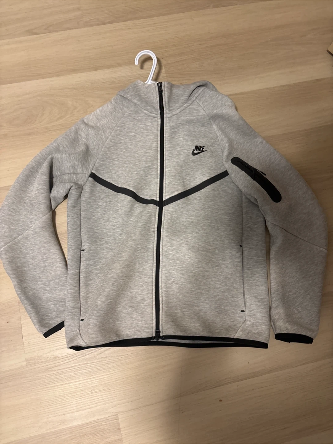 This is a grey Nike Tech Fleece hoodie. It's a size medium and made in Cambodia. The hoodie has a full zip closure and a zippered pocket on the sleeve.