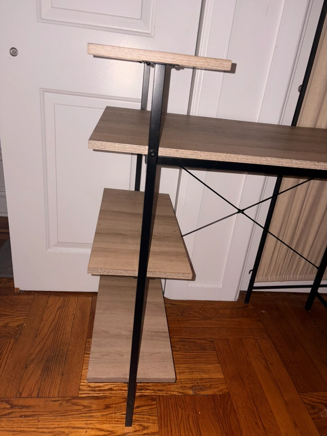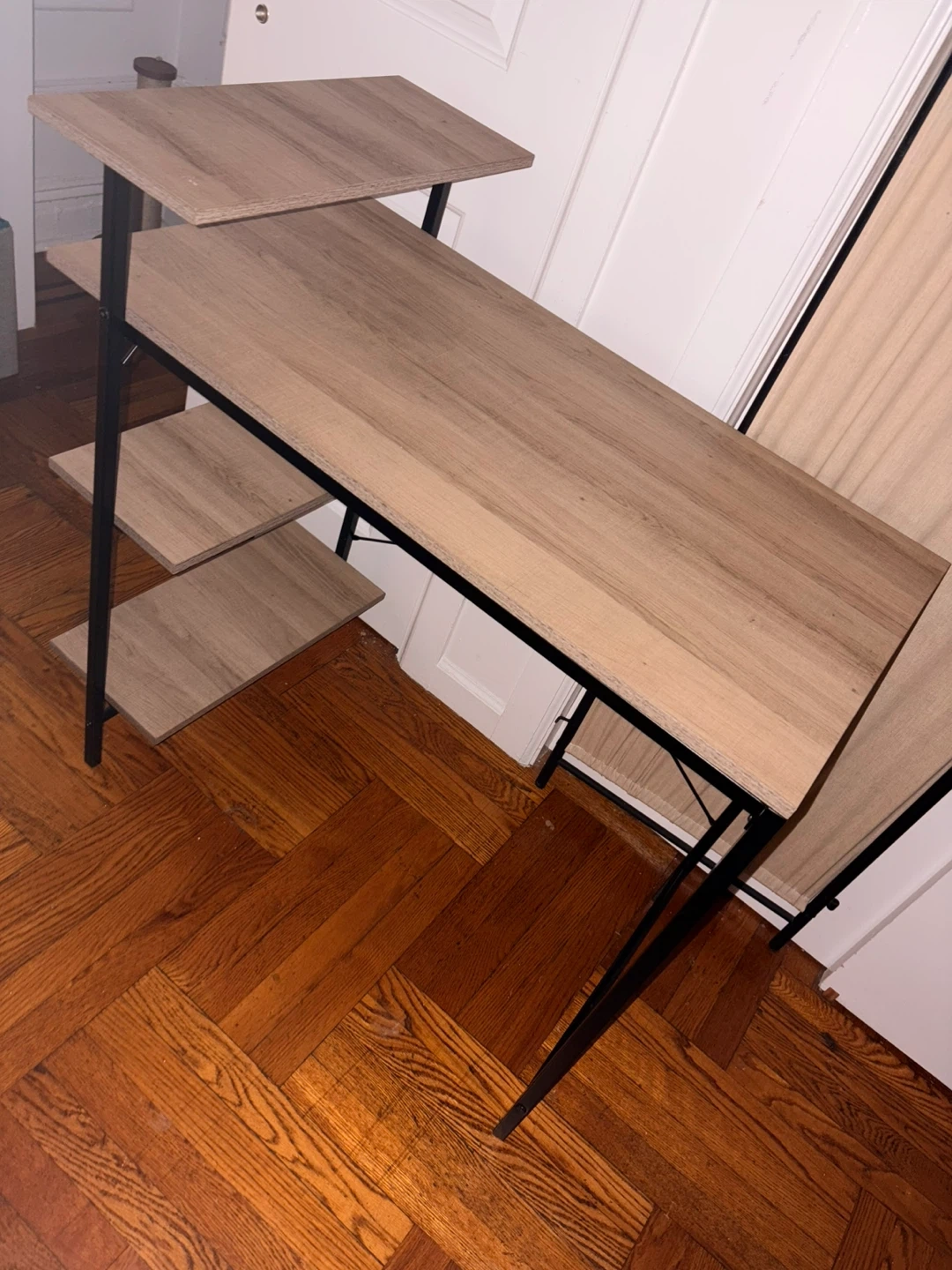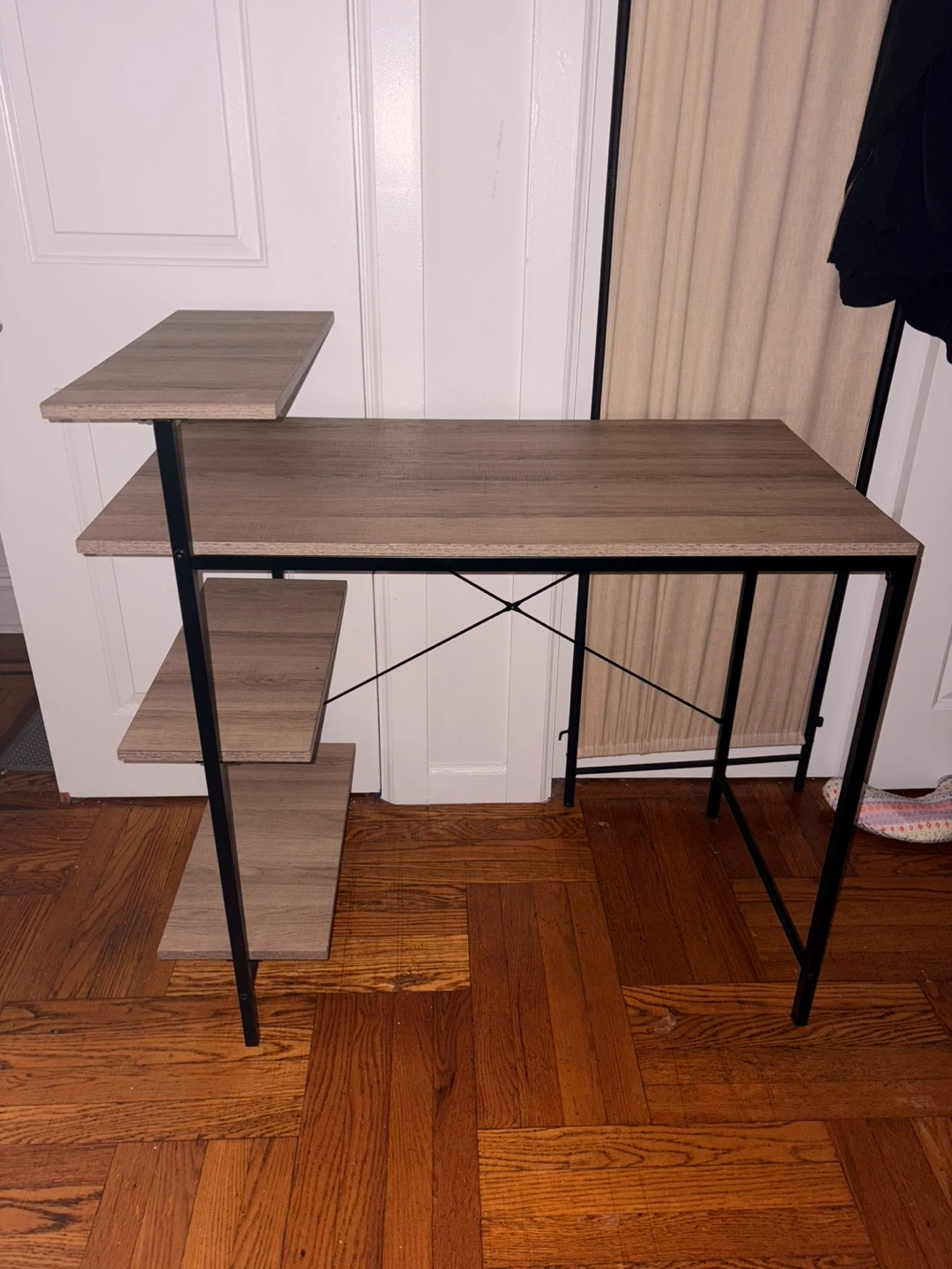 This is a desk with a wood grain finish and black metal legs. It has three shelves on one side for storage. Perfect for a small workspace!