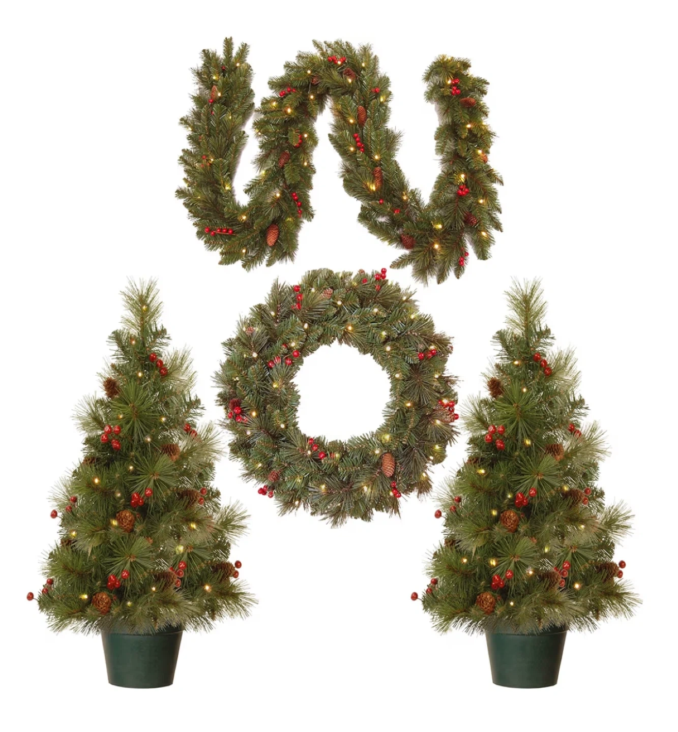 This 6-piece set includes a 20-inch diameter pre-lit wreath and 2-6 foot pre-lit garlands. It also comes with 2-3.5 foot tall pre-lit porch trees. All pieces are battery operated.