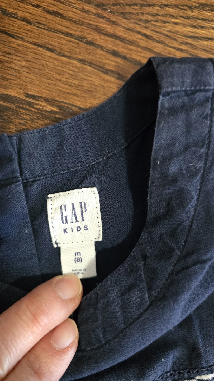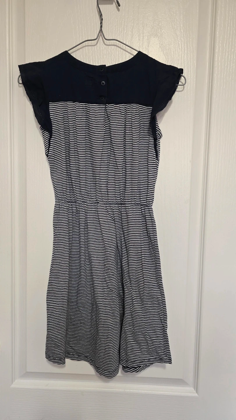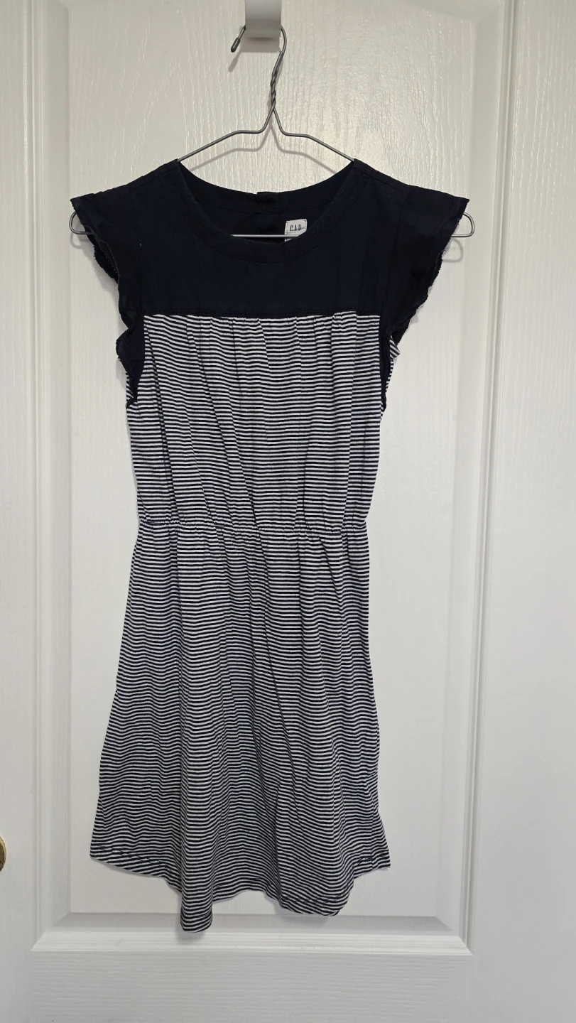 This is a GAP Kids girls' dress in navy blue with white stripes. It's a size 8. The dress has a navy blue top with ruffled cap sleeves and a striped skirt. It has an elastic waistband.