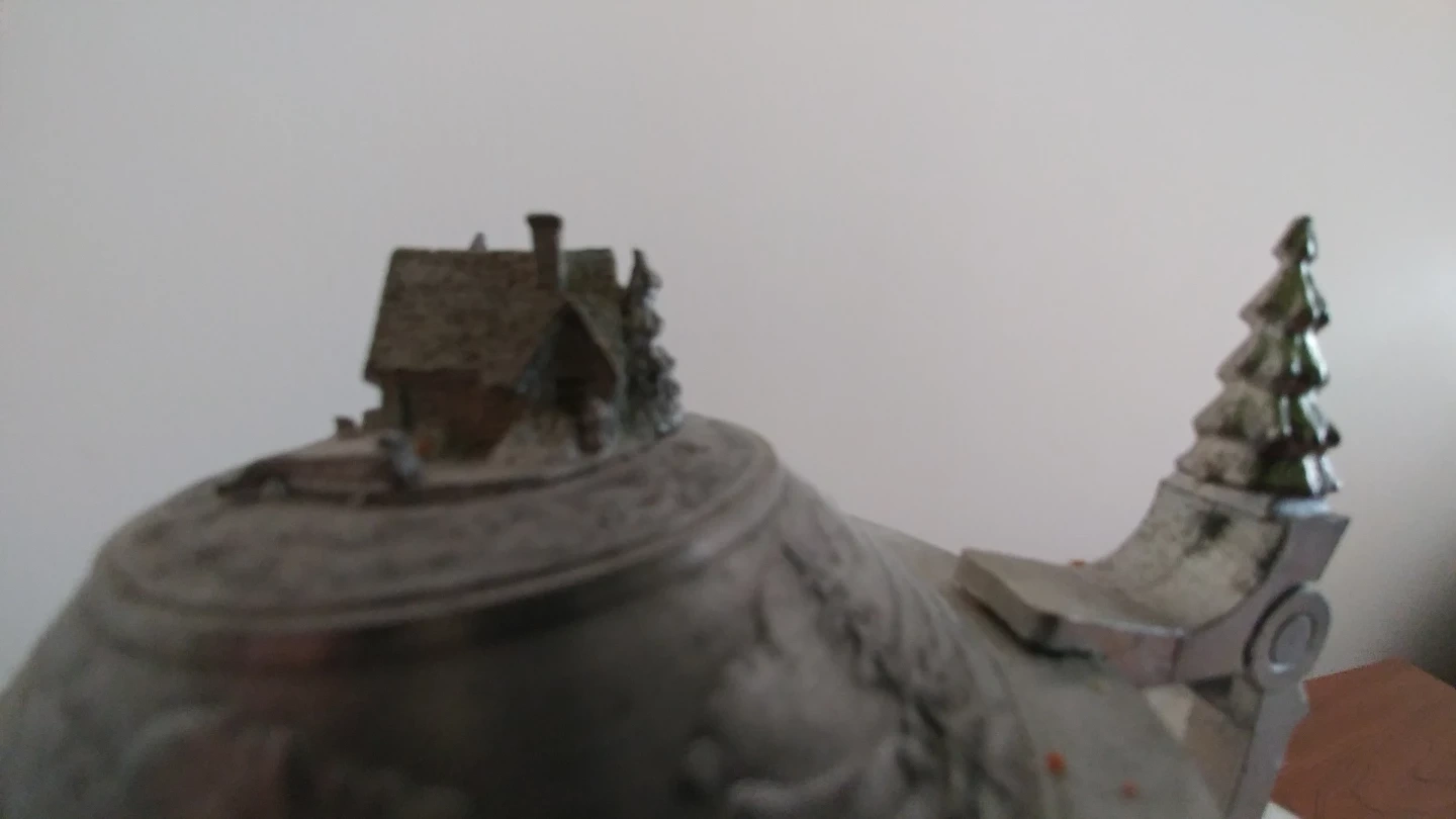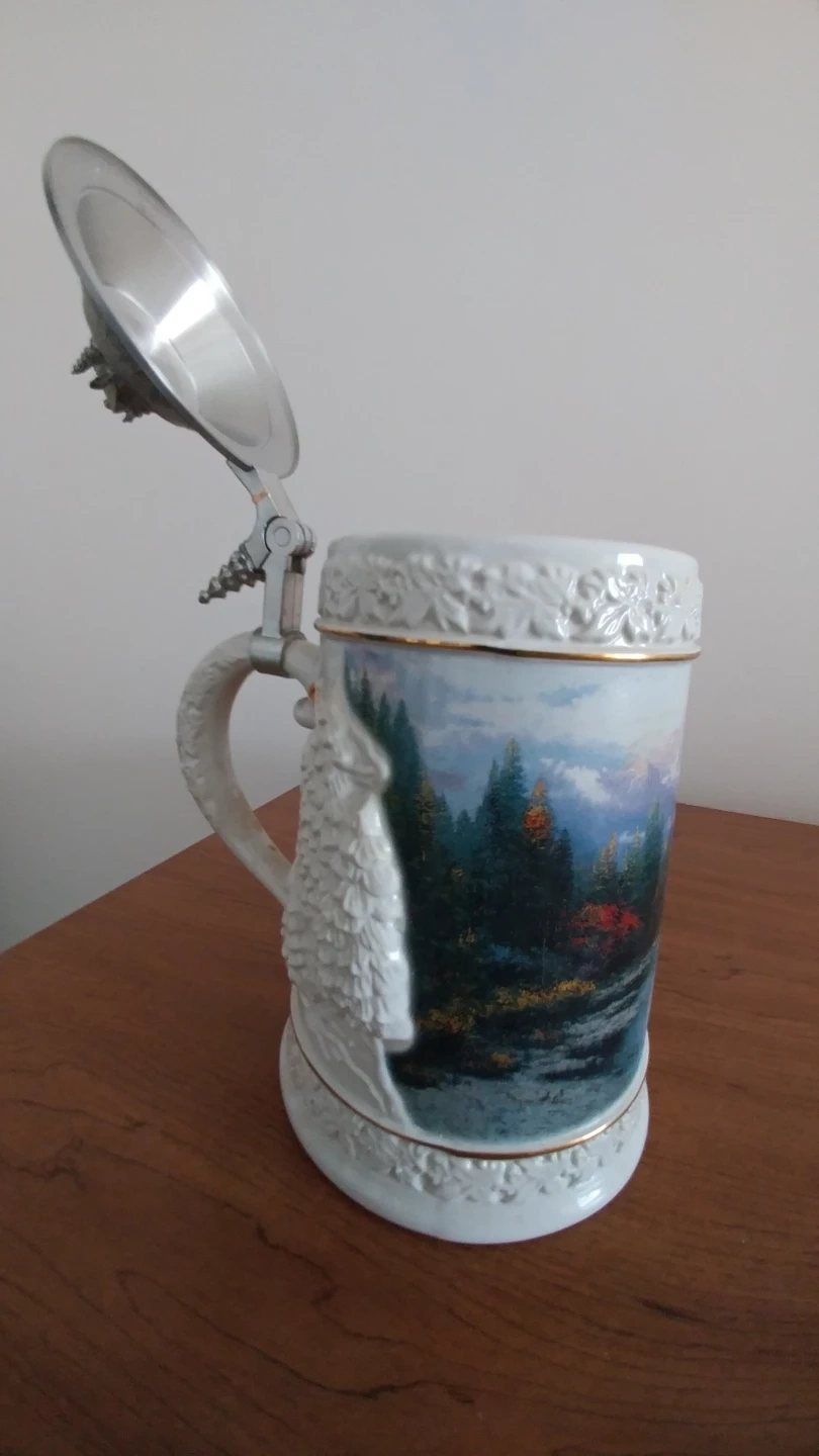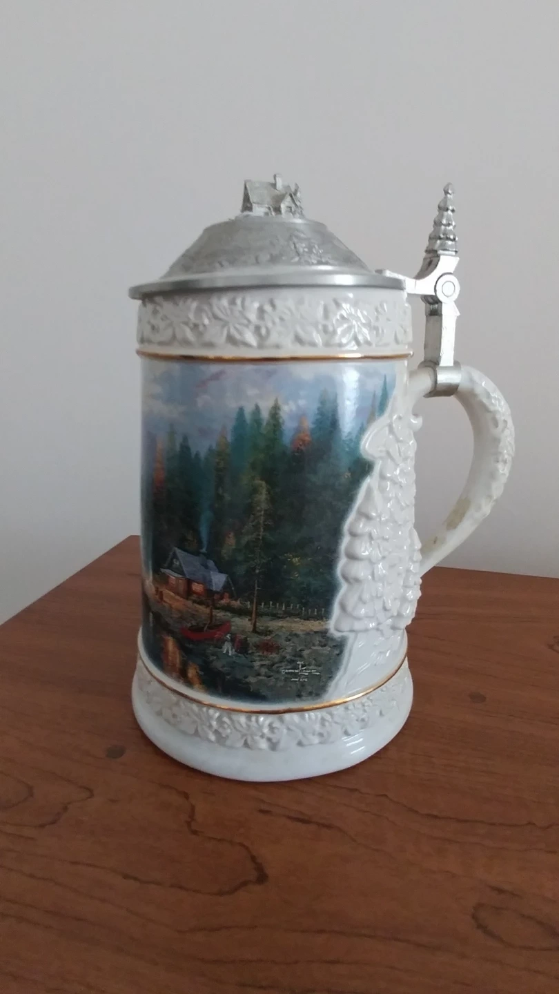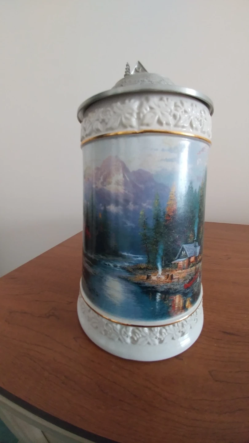 Selling a Thomas Kinkade collectible stein titled "A Quiet Evening at Riverlodge". This stein is part of the Thomas Kinkade Woodland Retreat Stein Collection. It evokes the soothing tranquility of the woods and wild creatures. It's a handcrafted stein that enriches the magic of Kinkade's art with fine bas-relief sculpture and a solid pewter sculpture on the lid