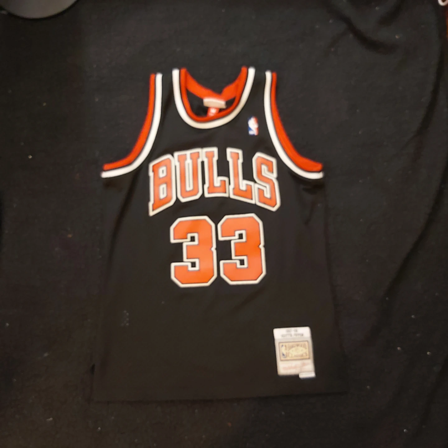 This is a Mitchell & Ness replica jersey for Scottie Pippen of the Chicago Bulls, number 33. It's black with red and white trim. A great piece for any basketball fan!