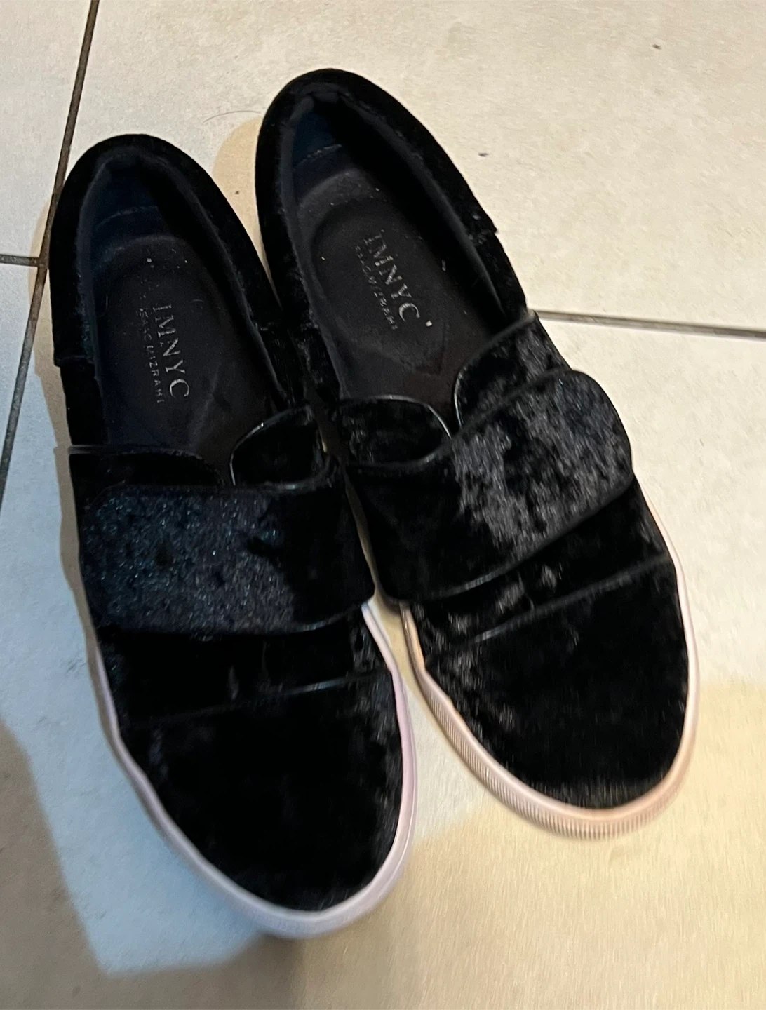 Selling a pair of I.N.NYC slip-on sneakers. They're a stylish black velvet. These are super comfy and easy to wear!
