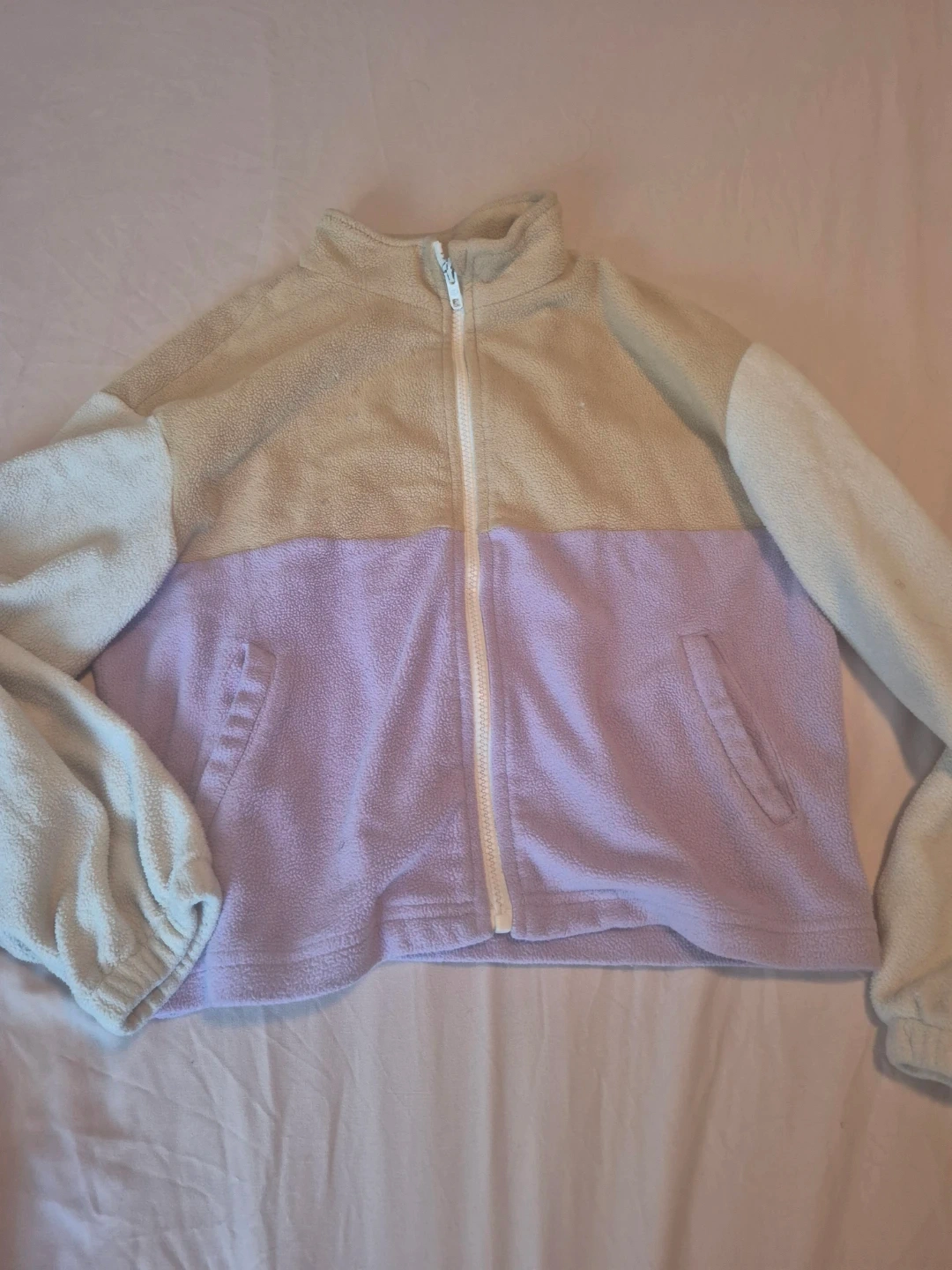 This cosy fleece jacket features a colour block design with beige, purple, and white panels. It's made of soft fleece material and has a full zipper closure with pockets. Great for staying warm!