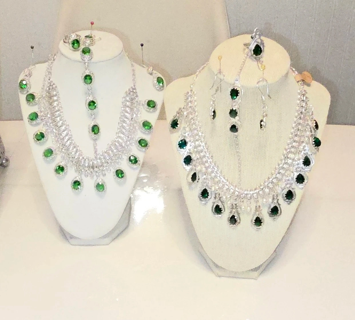 This set includes a statement necklace and matching dangle earrings. The intricate filigree design adds elegance to the pieces. They're crafted from a silver-tone metal and perfect for adding a decorative touch to an outfit.