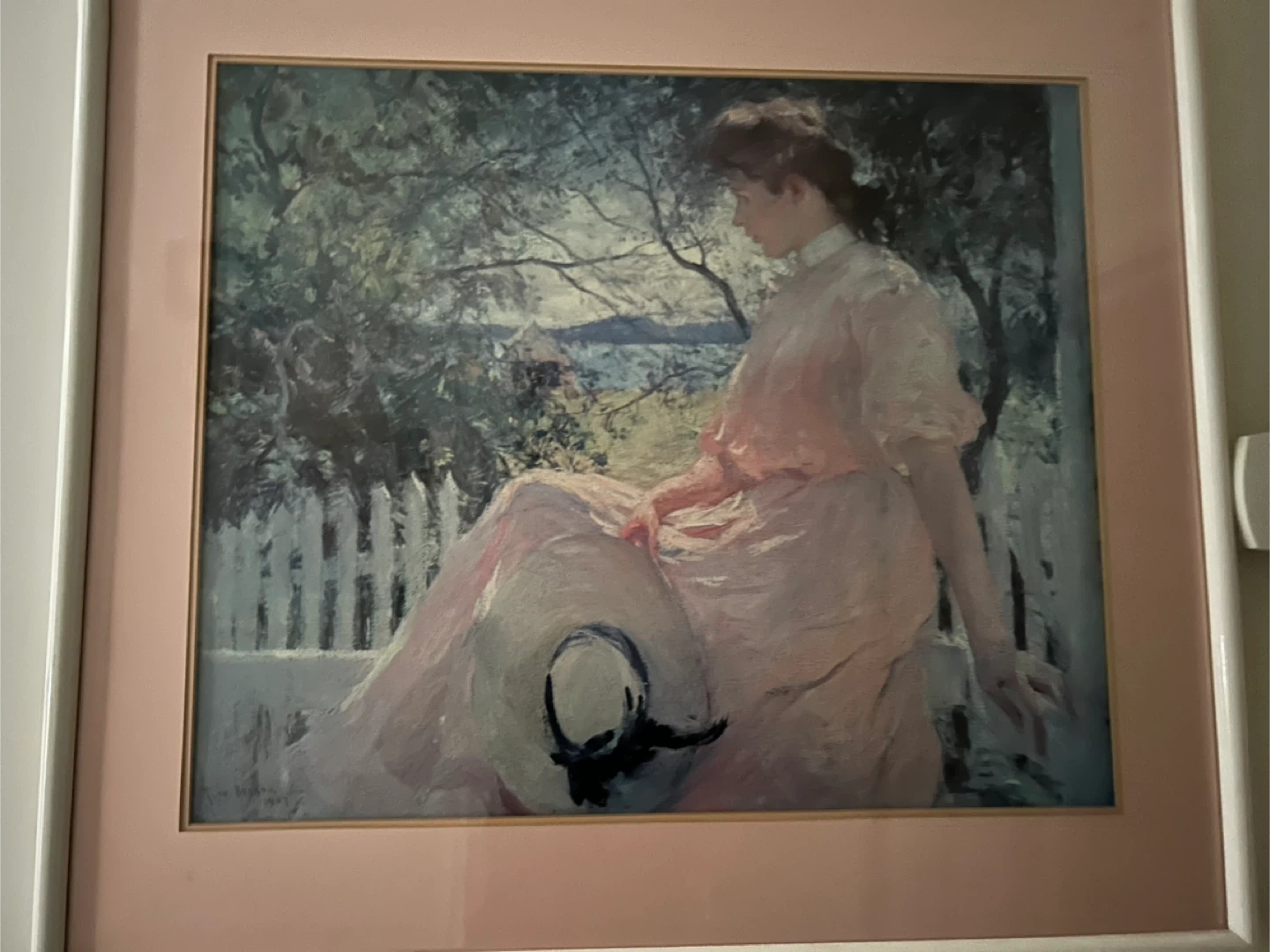 Frank Weston Benson "Girl in Pink Dress" large quality framed print. Framed measures 29 inches x 33 inches. The artwork is signed. It's a lovely piece for home decor. The print features a pink mat and a white frame.