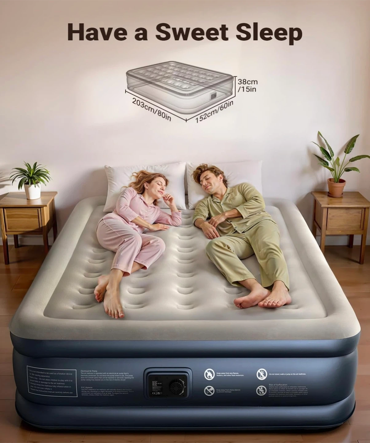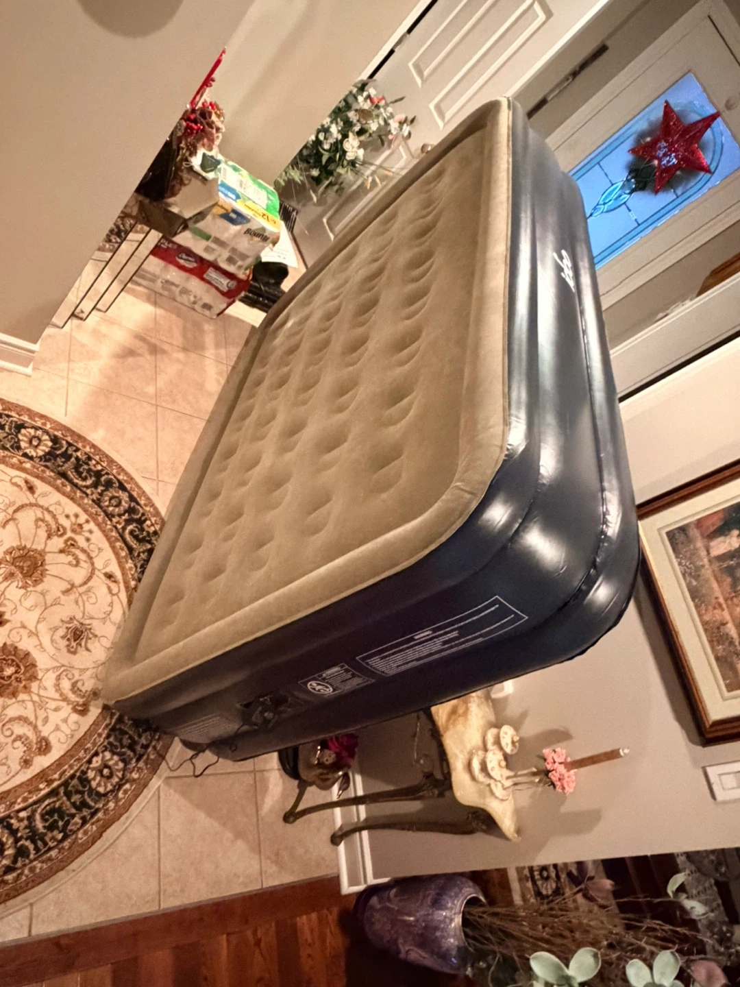 Selling a new queen size iDOO air mattress! It has a built-in pump for easy inflation. This inflatable mattress self inflates in just 3 minutes. It's waterproof and comes with a carrying bag, making it perfect for home, guests, or travel