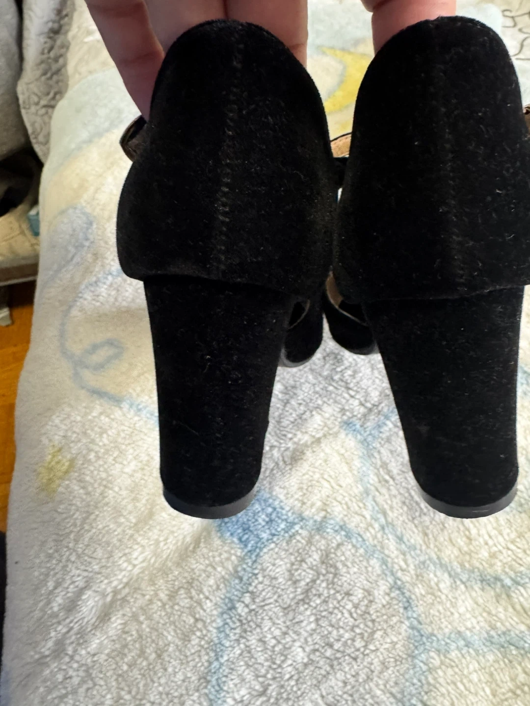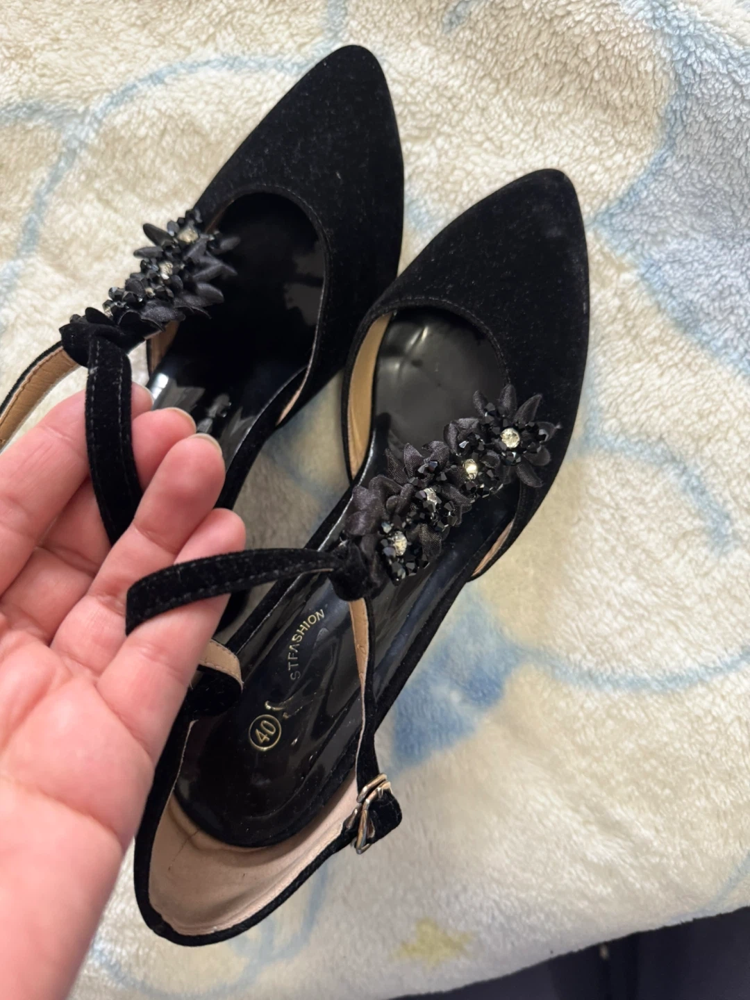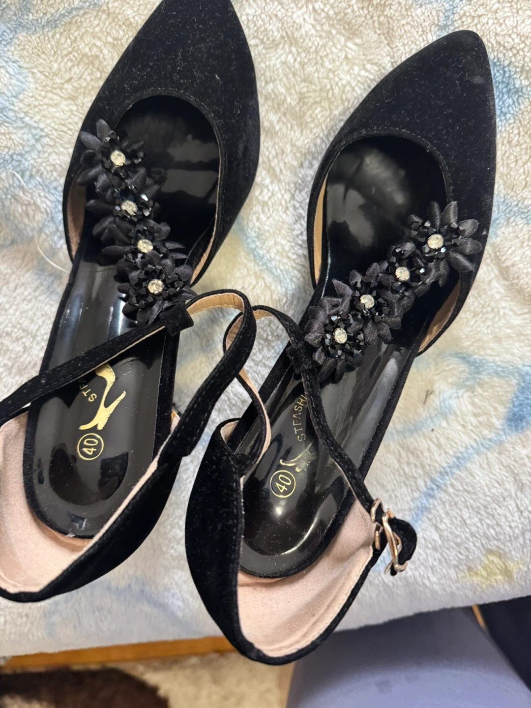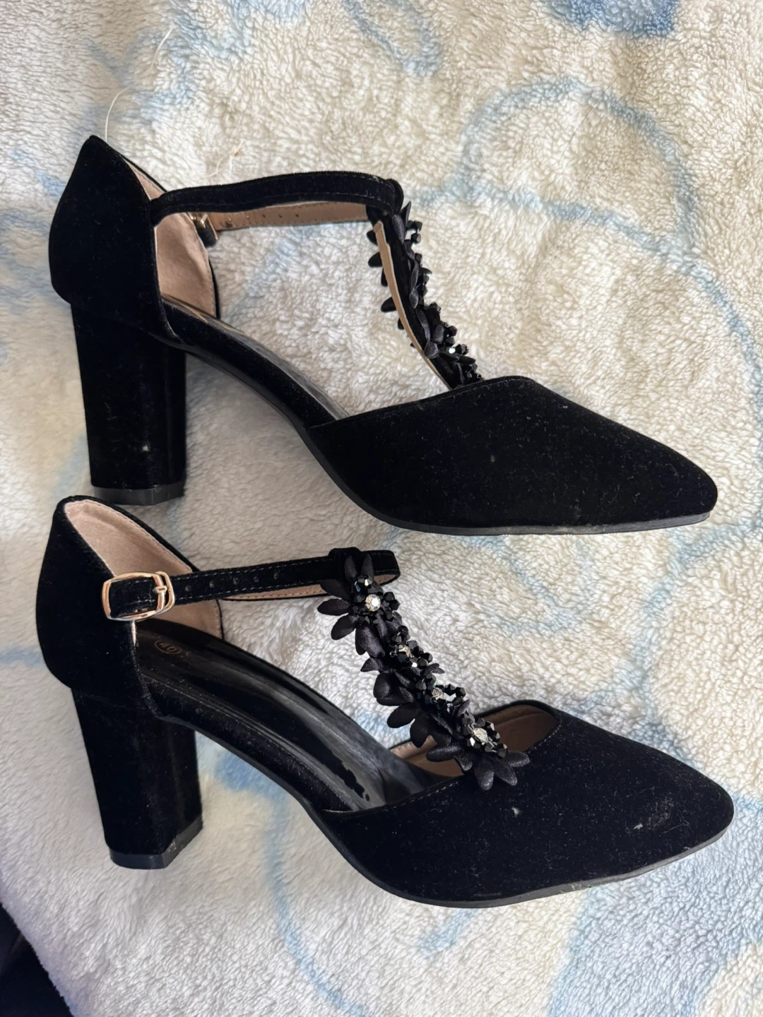 These stylish black heels are made of a soft suede-like material. They feature a decorative floral embellishment with rhinestones on the toe strap and ankle strap. The heel height appears to be approximately 3-4 inches. Suitable for dressy occasions! Just used 2 times