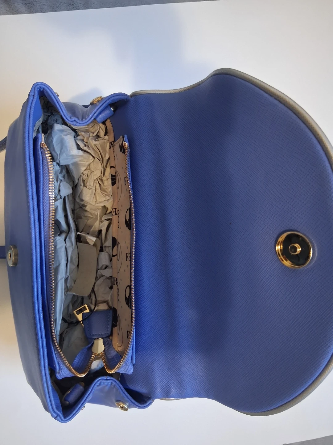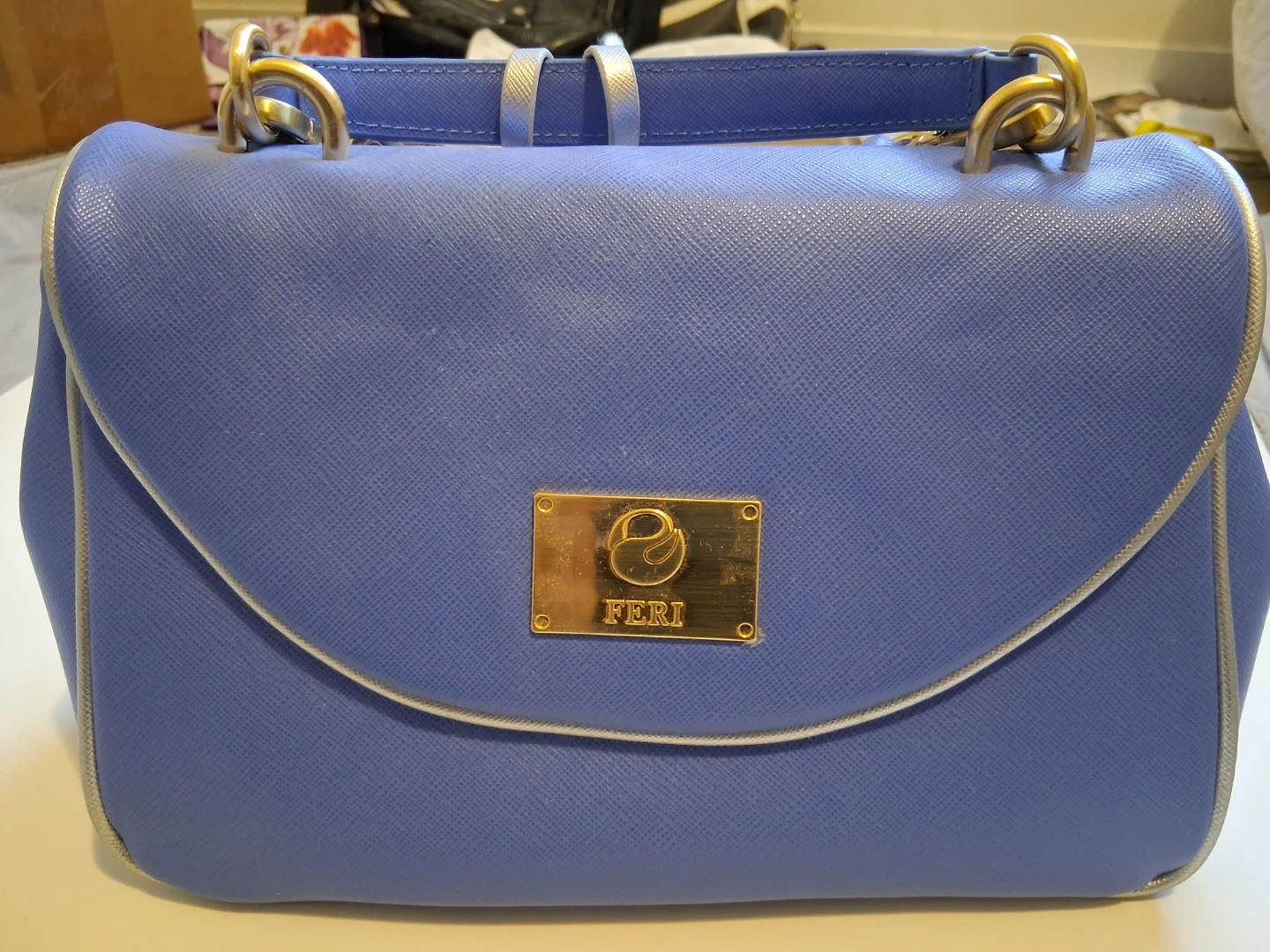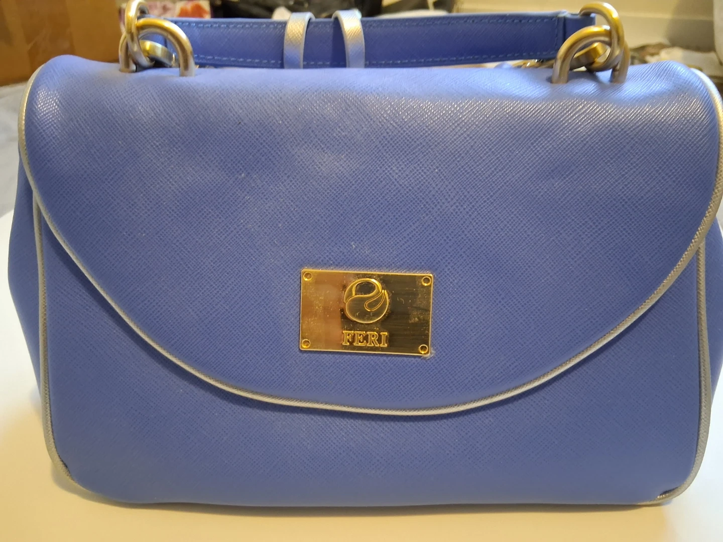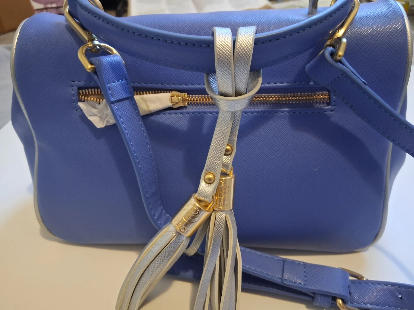 This Feri handbag is a stylish blue with a textured finish and gold-tone hardware. It includes a detachable crossbody strap for versatile wear. A decorative tassel adds a nice detail to the back zipper. The interior is lined and features a zippered pocket.