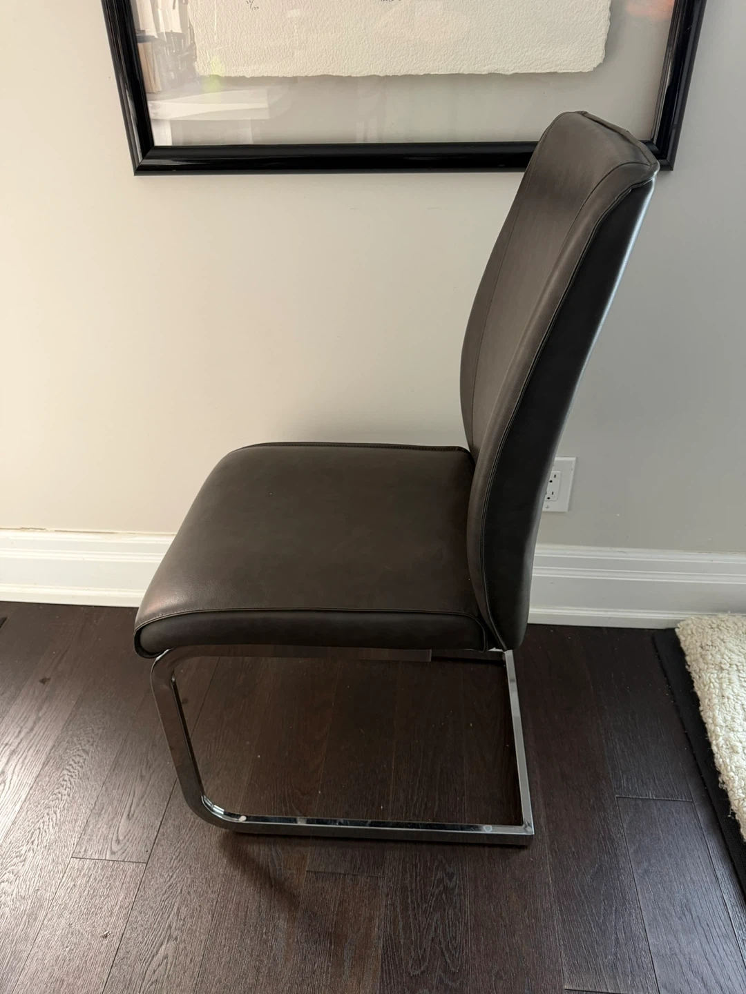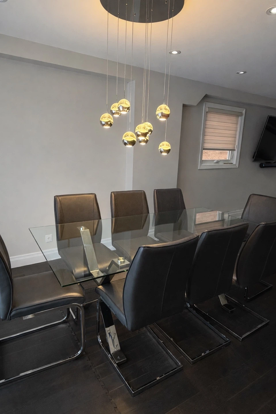 This set includes a sleek glass-top dining table with a sturdy metal base and eight comfortable leather chairs. The table's clear glass surface and contemporary design create a spacious feel. Chairs are upholstered in dark leather with chrome frames. This set is great for hosting dinners!
