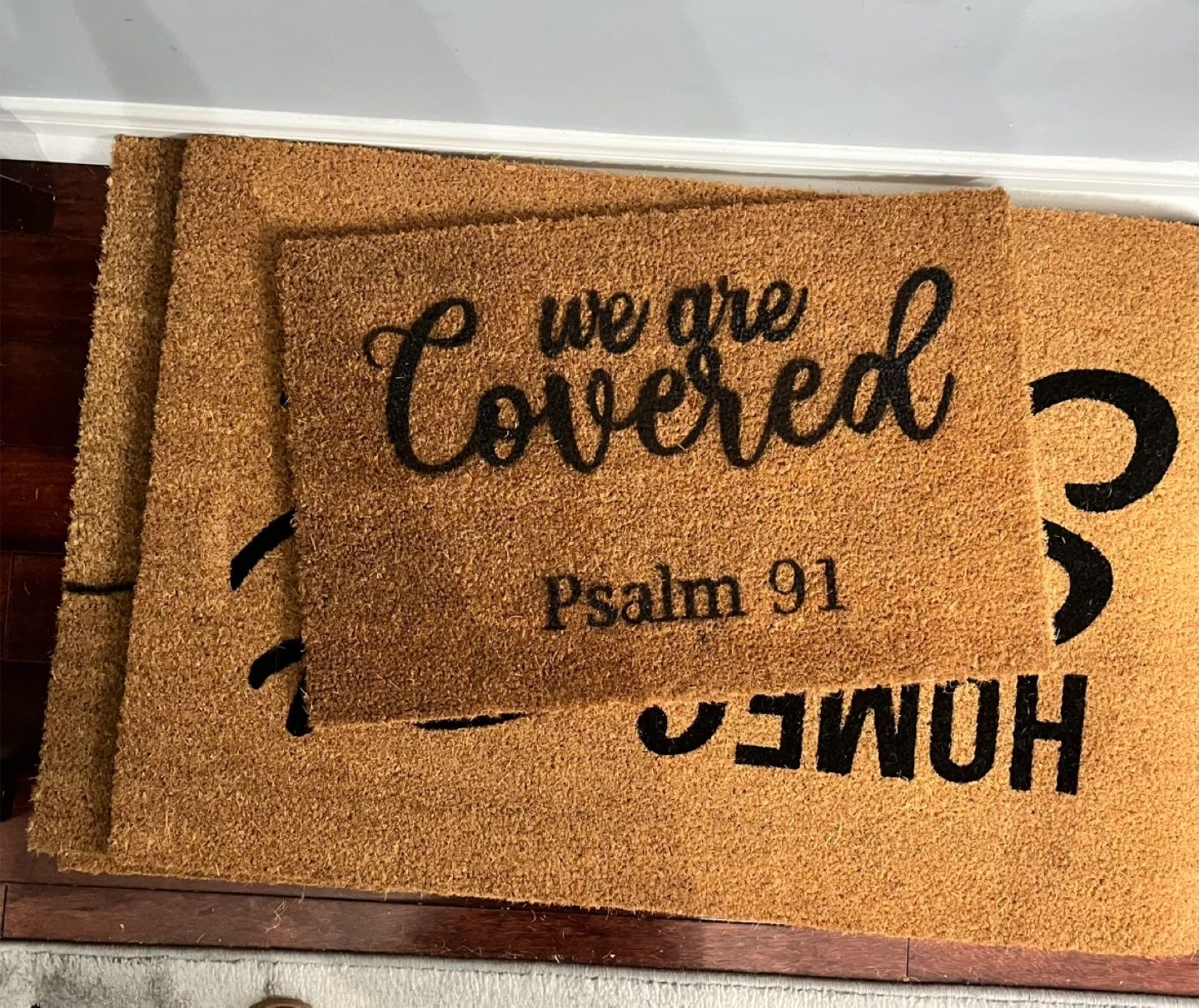 Spruce up your entryway with these cute doormats! They add a welcoming touch to any home. One doormat says 'Home Sweet Home' and the other says 'We are Covered Psalm 91'.