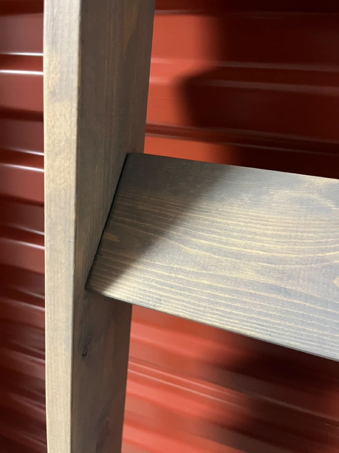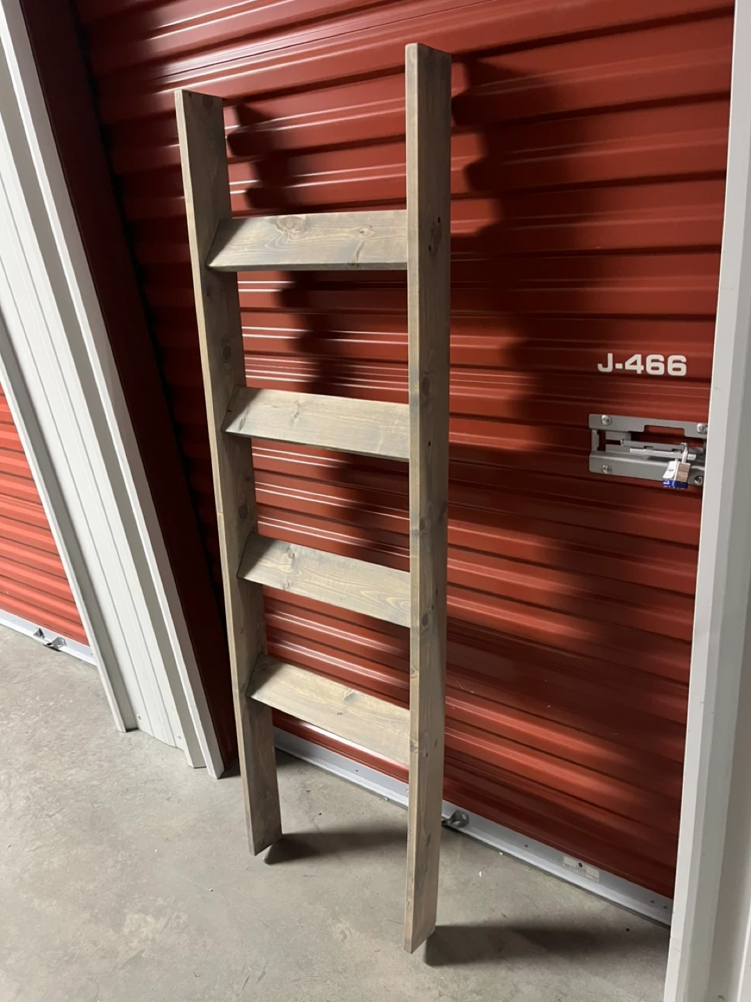 This is a rustic wooden ladder shelf. Measuring 17.5” x 59.75” x 3.5” It's made of solid wood with a grey wash finish. It would be great for displaying decor or plants!