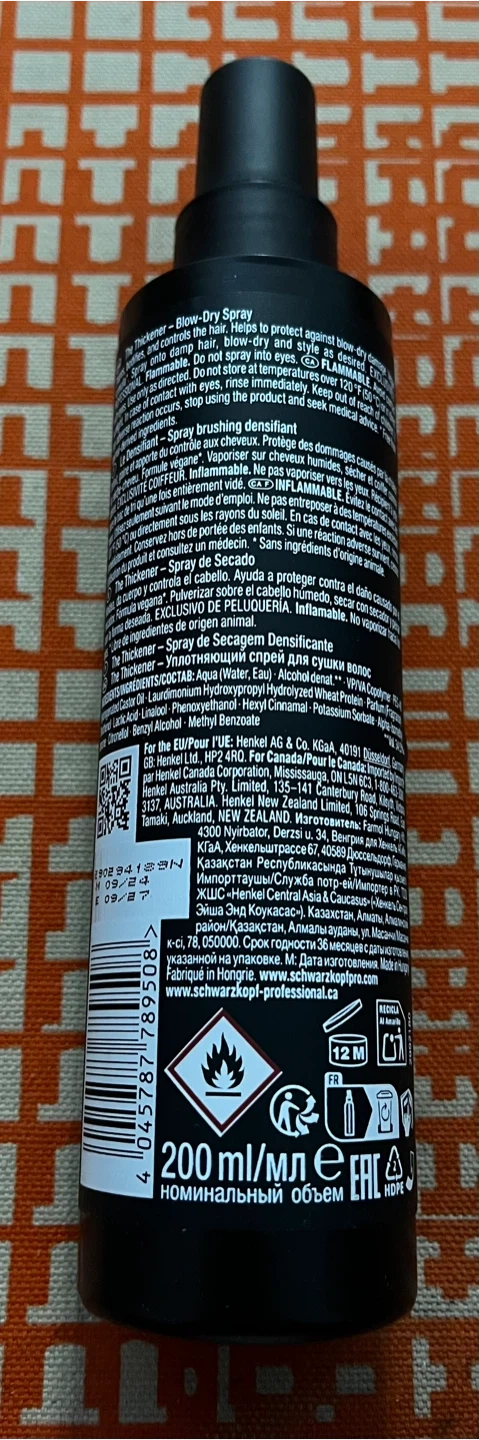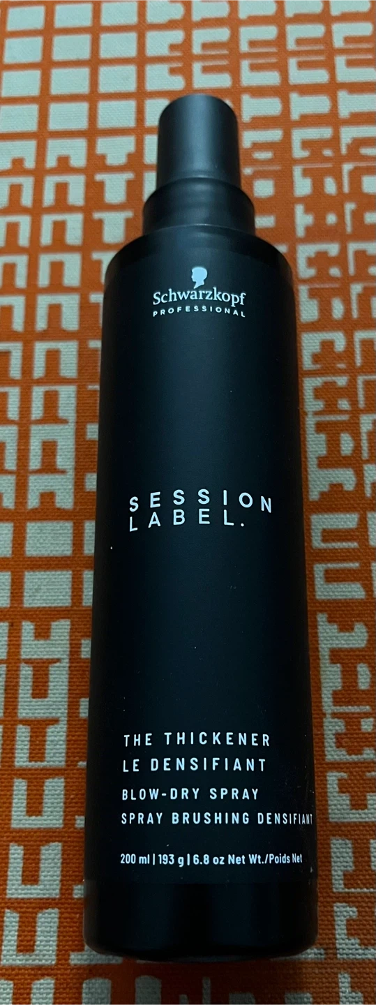 Schwarzkopf Professional Session Label The Thickener. This blow-dry spray helps to densify hair. It's 200 ml or 6.8 oz net weight. Contains Water, Alcohol Denat., and Hydrolyzed Corn Starch.
