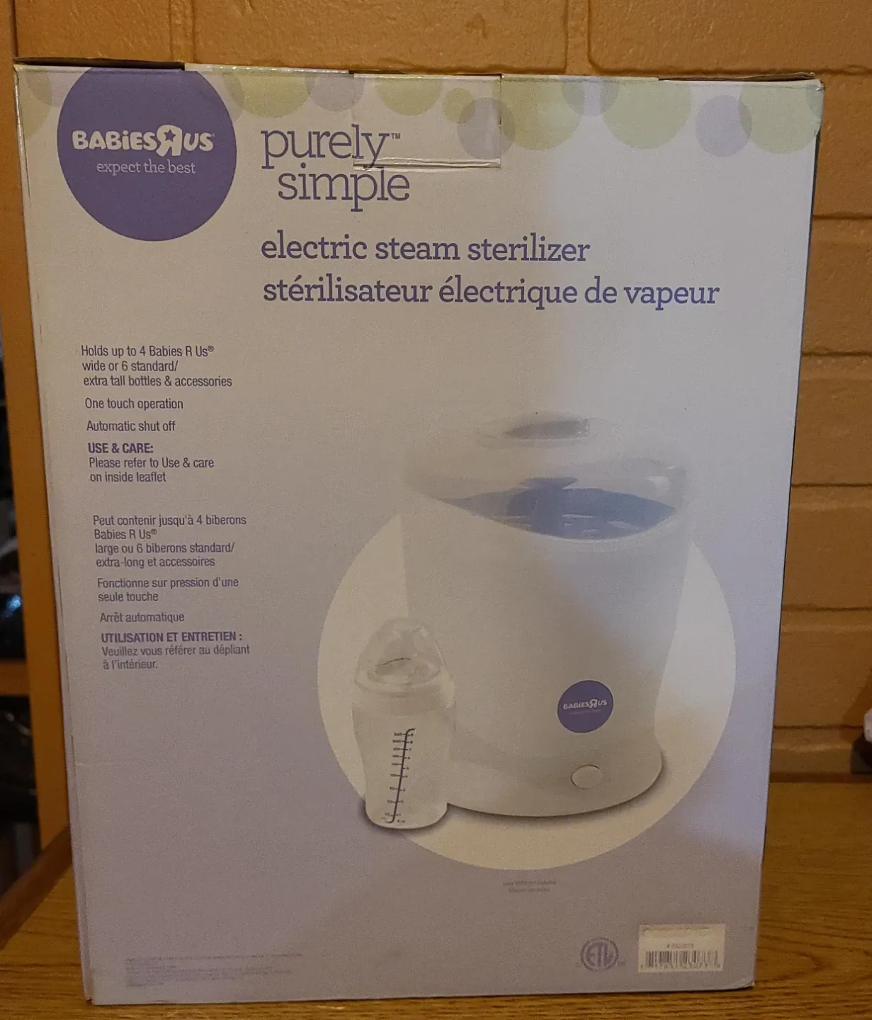 Babies R Us electric steam sterilizer. Holds up to 4 wide or 6 standard/extra tall bottles and accessories. Features one-touch operation and automatic shut-off. Perfect for sterilizing baby bottles and parts!