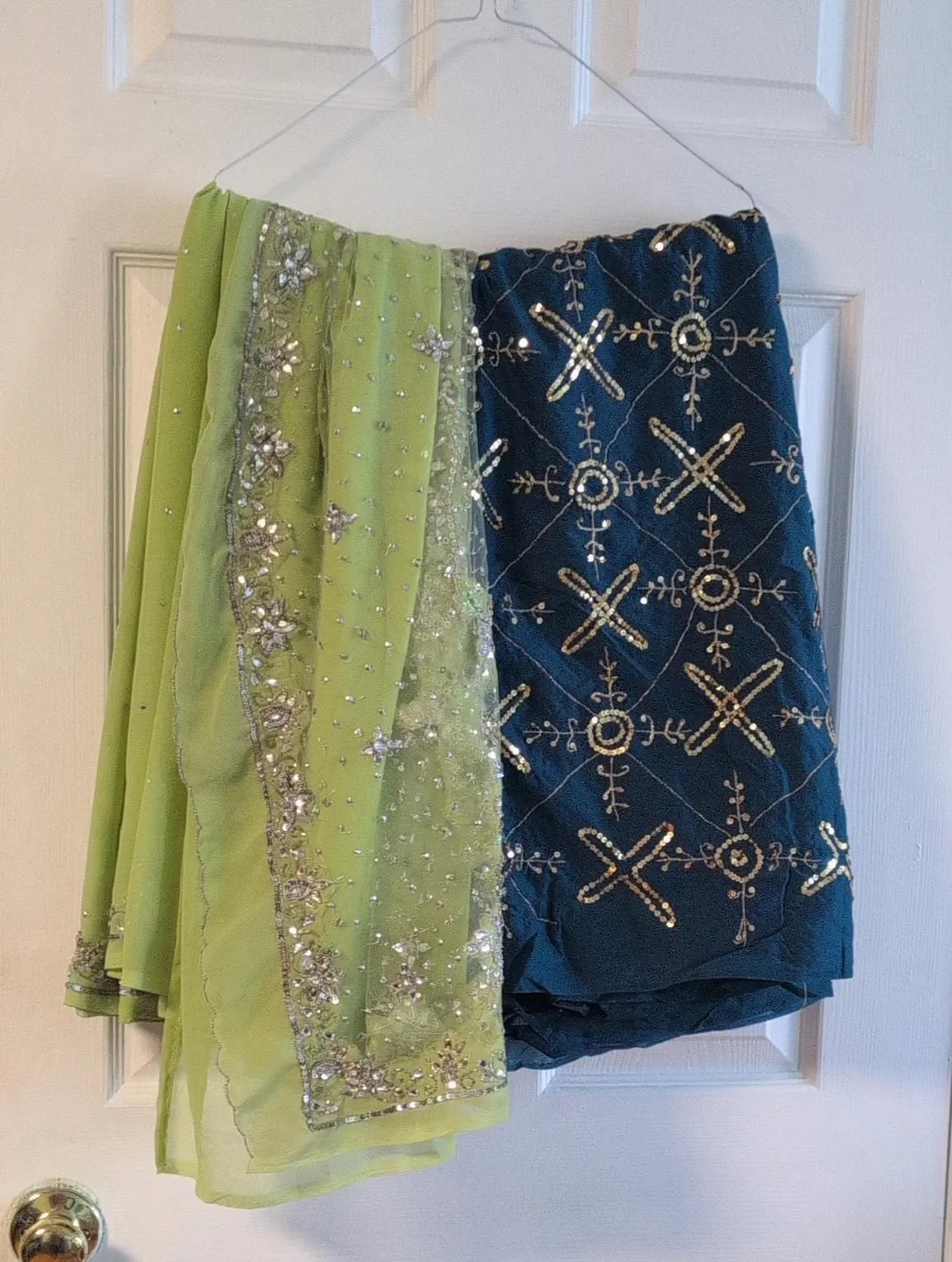 Beautiful lime green chiffon two saree sequin and bead embellishments. Matching dark teal l fabric features intricate gold sequin and beadwork. A stunning traditional outfit! Two saree