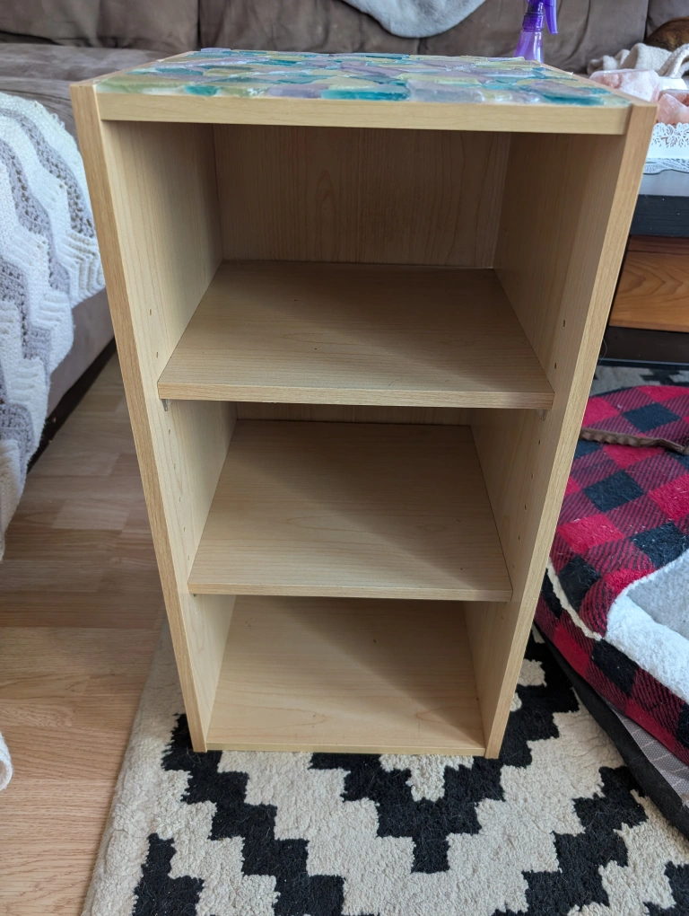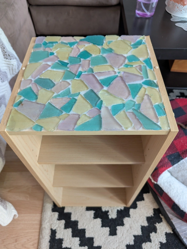 Cute little mosaic tile side table! It has three shelves for storage or display. The top is decorated with a colourful mosaic pattern, making it a unique piece for any room