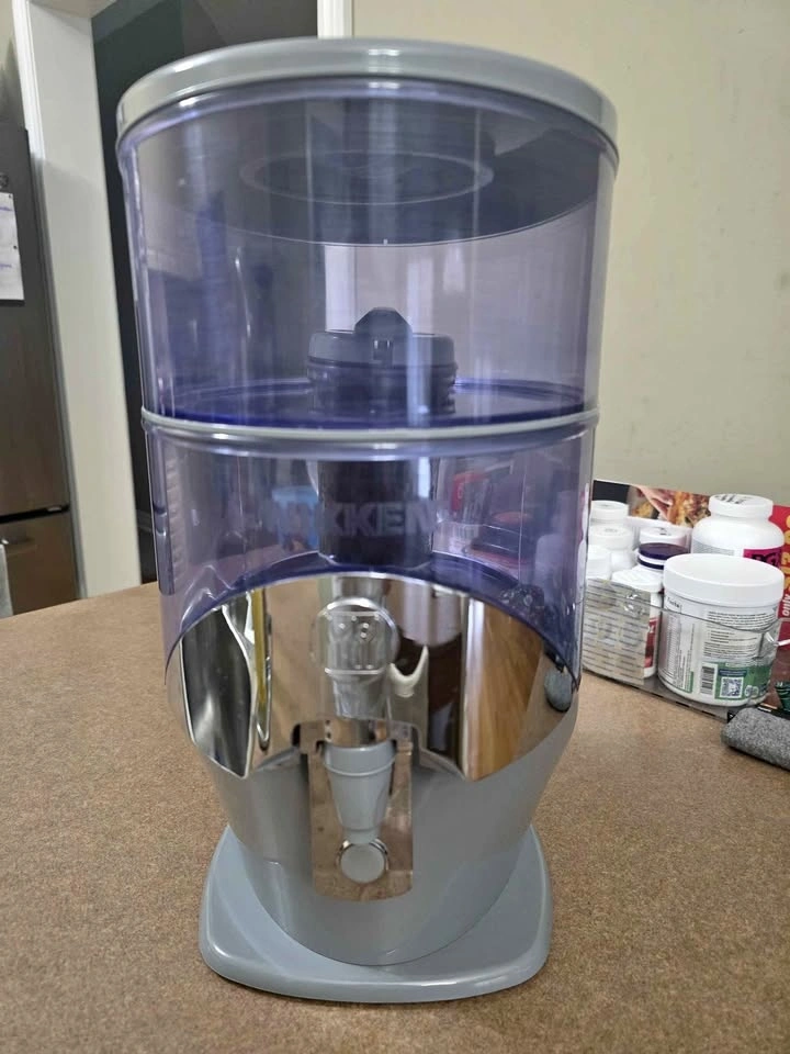 Clean Nikken PiMag Waterfall water filter dispenser. Has clear top reservoir and bottom section with filter and mineral stones. Dispenses purified water.